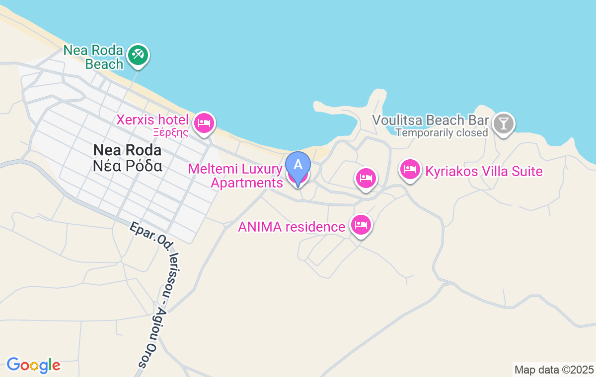 Meltemi Luxury Apartments is one of the recently built accommodations in Nea Roda, with an excellent location. Only 80m from the sea, it has modernly furnished units for 2-4 people, and in addition to the good location, the amenities offered by this facility are a beautifully decorated and fenced yard with a corner for the youngest (but also the elderly), as well as parking for all guests.