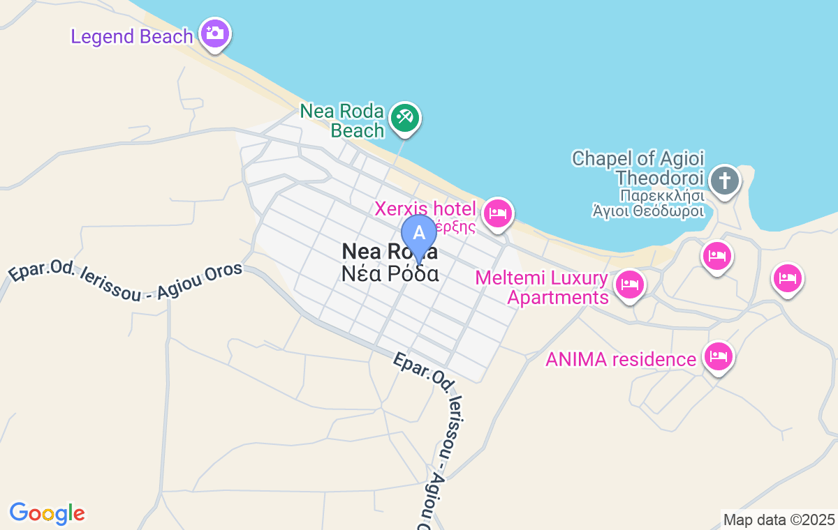 San Giorgio Luxury 2 Studios is situated approximately 6 km from the town of Ierissos, which boasts a variety of restaurants specializing in fresh seafood as well as traditional Greek tavernas serving homemade olive pie and local wines. In addition to the amenities already mentioned, there are many other attractions in the immediate vicinity of San Giorgio Luxury 2 Studios that will enrich guests’ stay on the Athos peninsula. One of the most visited is Xerxes’ Canal, a roughly 2 km–long waterway carved in the 5th century BCE by order of the Persian King Xerxes I so that his fleet could bypass the stormy waters around the tip of the peninsula. For those who prefer nature and the sea, Komitsa Beach lies 5 km from Nea Roda and is famed for its unspoiled shoreline and turquoise waters. The island attracts lovers of the authentic Mediterranean atmosphere, pristine beaches, and seaside fish tavernas. Thessaloniki International Airport is 109 km away, facilitating easy access for guests who prefer to travel by plane, while the proximity of the main highway affords excellent connections to the rest of Halkidiki. San Giorgio Luxury 2 Studios combines the comfort of modern amenities with the unforgettable atmosphere of the Athos peninsula, promising guests not only relaxation but also an authentic experience of the Greek Mediterranean way of life.