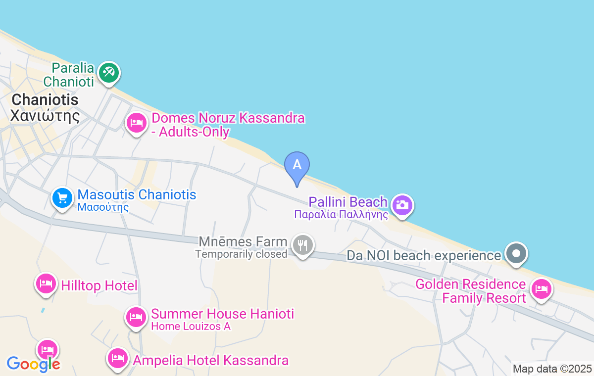 Siss Home is located in a popular and very nicely decorated resort on the east coast of the Kassandra peninsula, Hanioti, in the first row and only 60m from the beach.