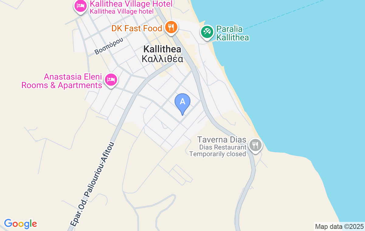 Pi Polis Blue Apartment is a two-room apartment in a complex in the eastern part of Kallithea. The apartment is oriented towards the southwest. It is located on the ground floor.