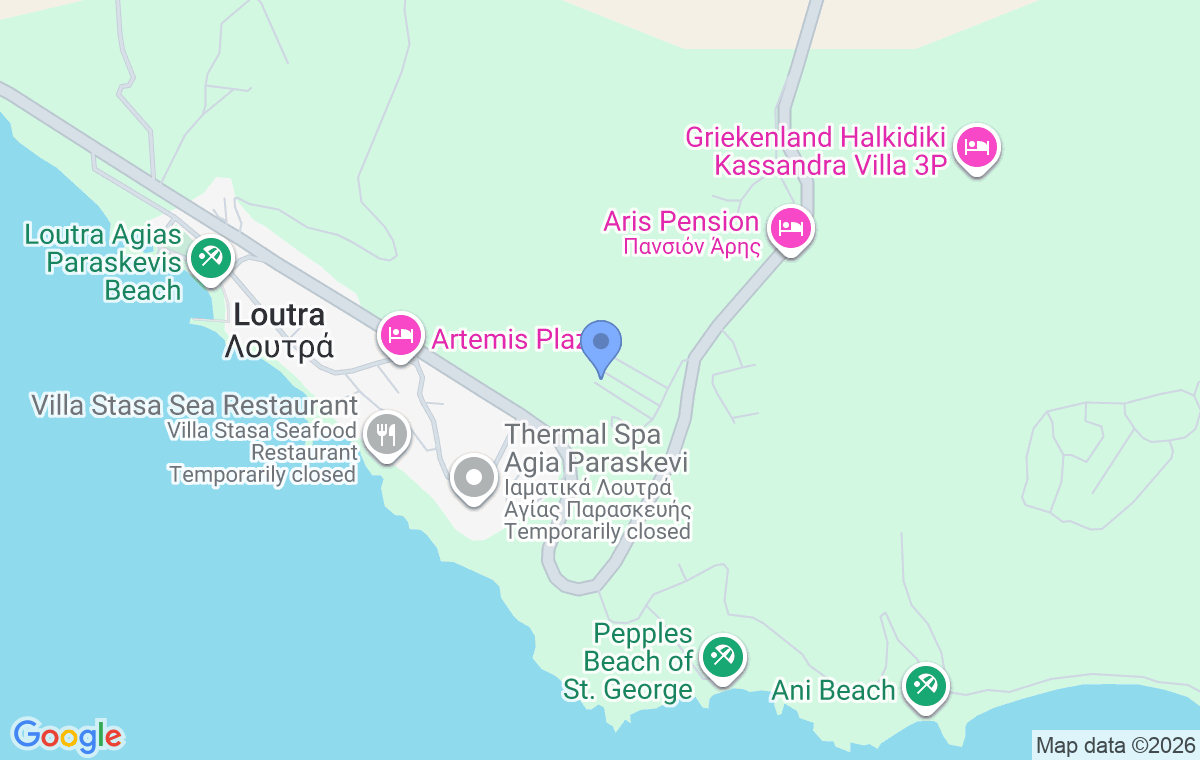 Loutra is known for its thermal springs and traditional architecture, and it is often referred to as a small spa destination in the western part of Kassandra. At the top of the cliff above the sea, there is a spa center that you can visit, while below it there is a natural thermal spring where visitors can enjoy the warm water, although the access is not particularly easy. The water from this spring has a temperature of about 39°C and contains sulfur, making it suitable for the treatment of rheumatism, arthritis, and certain skin conditions.