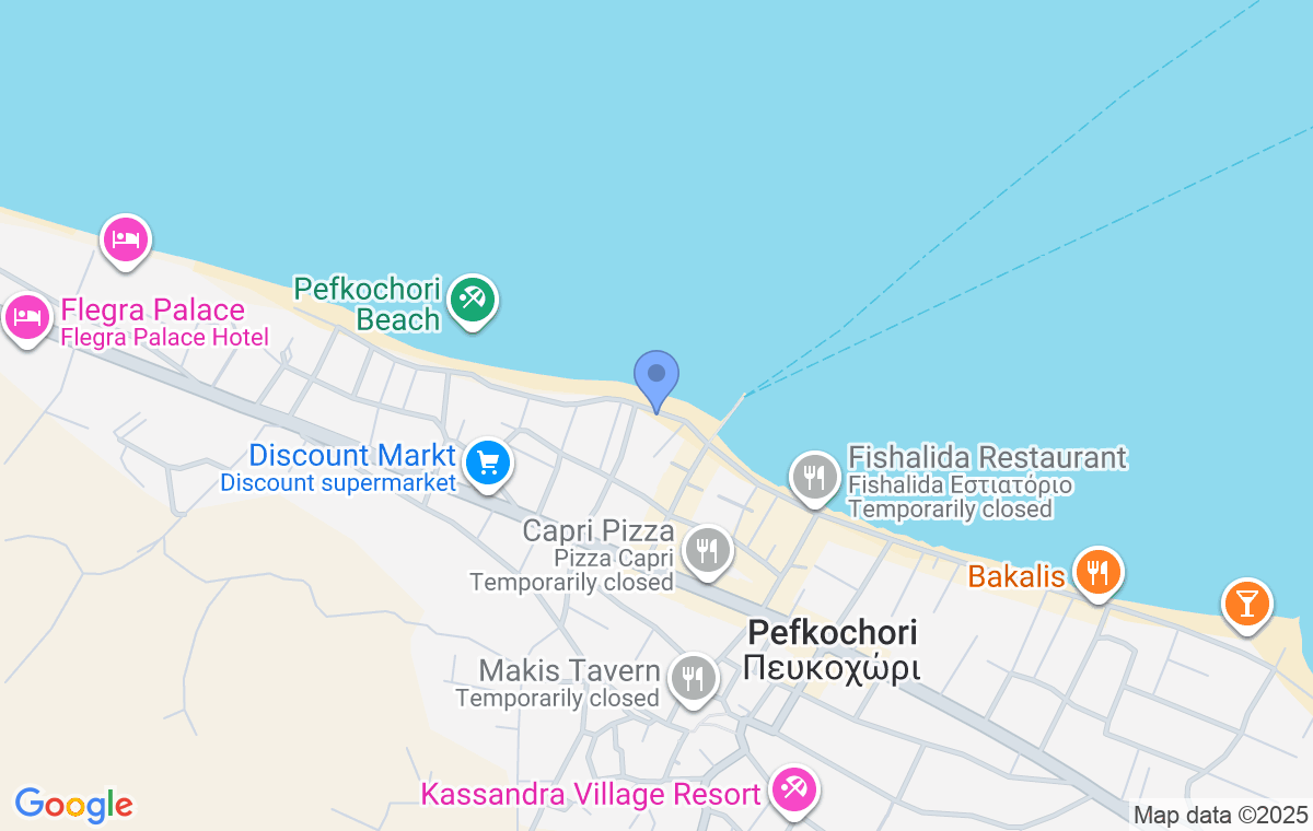 Pefkohori is one of the most popular resorts on the Kassandra peninsula, located on the eastern coast of Halkidiki. The village stretches between pine forests and the sea, blending natural shade with the scent of the Mediterranean. The beach is long and mostly narrow, with fine pebbles and a gradual entrance into the water, making it ideal for families with children. A seaside promenade lined with tavernas, cafés, and shops runs along the coast, while in the summer months the town comes alive with a vibrant atmosphere and a wide range of activities. Pefkohori has two distinct faces—the old part above the main road, with narrow alleys, a central square, and traditional houses preserving the spirit of a Greek village, and the newer seaside area where most apartments and hotels are located. This blend of authentic charm and modern tourism gives the town its unique appeal, offering guests both peaceful moments in the old center and the lively rhythm of a Mediterranean resort by the sea. The accommodation is approximately 98 kilometers from Thessaloniki International Airport.