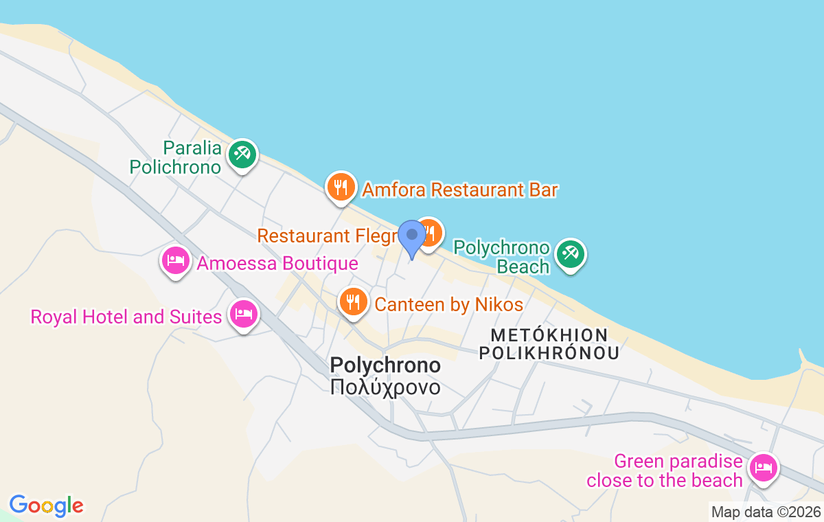 Polihrono is one of the most well-known and most popular resorts on the eastern coast of Kassandra, the first peninsula of Halkidiki, which with its lively atmosphere and family character attracts many visitors throughout the season. The spacious sandy beach with crystal-clear sea is ideal for carefree swimming, especially for children. Along the coast stretches a promenade filled with traditional taverns, cafés, bars, and shops, while all everyday facilities, including supermarkets and pharmacies, are easily accessible. Thanks to its favorable location, Polihrono is an excellent base for exploring Kassandra; it is only 6 km from Hanioti and about 9 km from Pefkohori, while the airport in Thessaloniki is 88 km away. This is a place full of life and energy, ideal for guests who want an active and content-filled summer holiday.