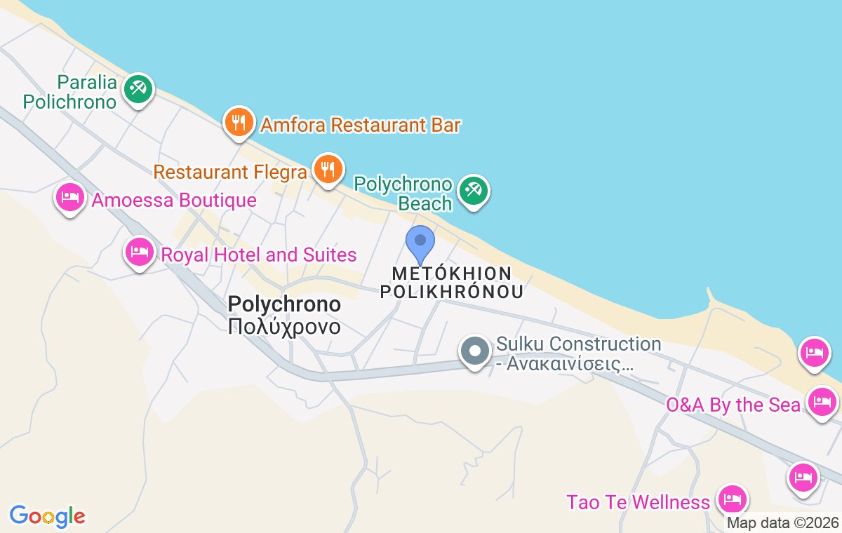Polichrono is a popular holiday resort on the eastern coast of the Kassandra peninsula, on Halkidiki. With its pleasant atmosphere, long sandy beach, and diverse amenities, it attracts many visitors throughout the season. The beach is long and sandy with a gradual entrance into the sea, making it especially suitable for families with children. Along the coastline, there is a promenade lined with traditional tavernas, cafés, bars, and shops, while supermarkets, pharmacies, and other daily necessities are easily accessible. Thanks to its convenient location, Polichrono is an excellent base for exploring Kassandra, Hanioti is 5 km away, Pefkohori 9 km, and Thessaloniki Airport is 95 km from the town.