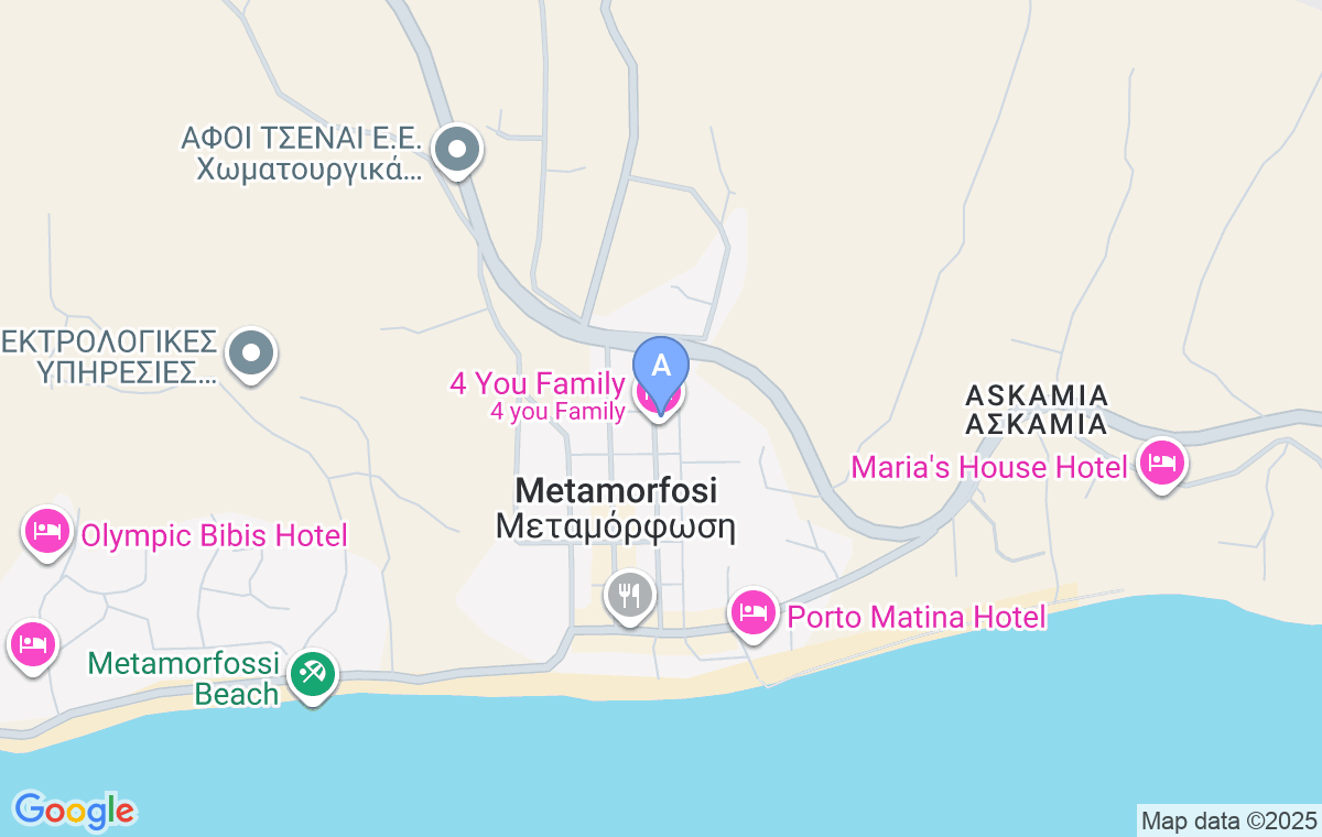 Located in the center of small and peaceful Metamorfosi, it is around 450m far from the narrow, sandy-pebble beach. All amenities offered by this family place, few taverns, pizzeria, cafes, bakery and few shops, you can reach in only few minutes on foot. If you need a bigger market, there is a supermarket Lidl (and few others) in Nikiti (7-8km far).