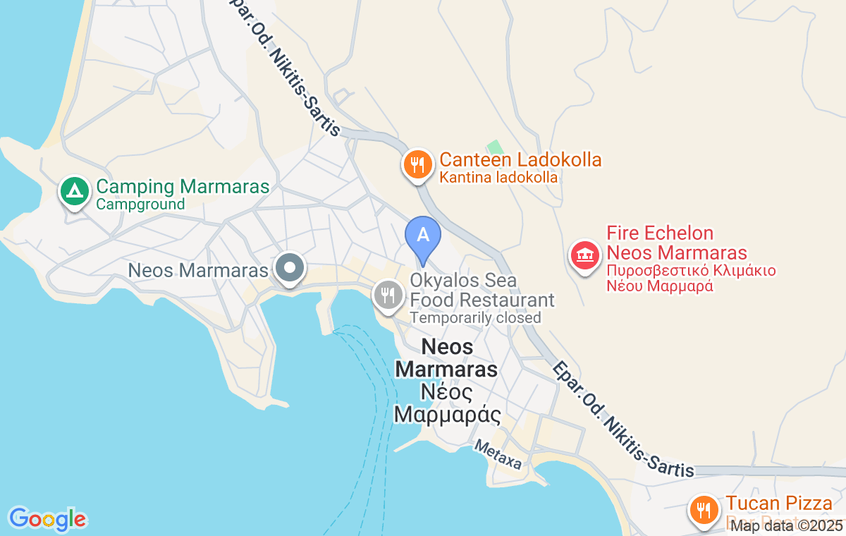 Arriving from the direction of Nikiti, turn off the main road at the second entrance to Neos Marmaras and continue ahead for about 400m.