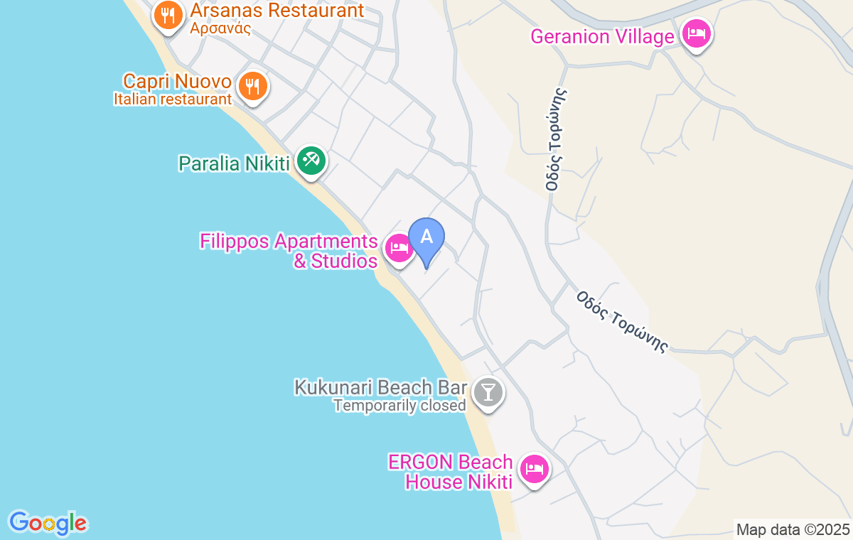 You will find Eva’s Houses on the seafront promenade, in the direction from the center of Nikiti to Saint George Beach.