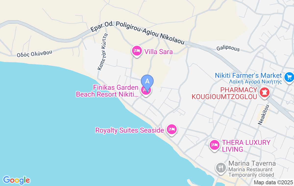 At the entrance to Nikiti, turn right at the traffic lights to Neakitou Street and go almost to the very end. Before going out to the promenade and the beach, turn right into the street parallel to the beach and just continue straight, by Egialou Street (you will know that you are on the right path as soon as you see the Marina hotel on the right side of the road, and just continue straight) until you see the small chapel of St. Barbara. About 130m from it, straight, you will see a signboard for Angelos accommodation, just continue ahead for 100m, then turn right and in 150m you will be in fron of the Athos Blue Nikiti Apartments.