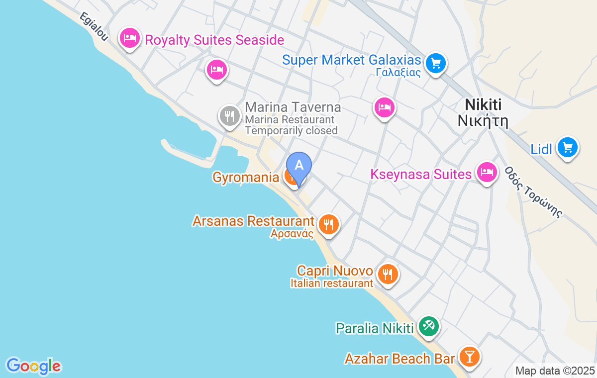 After passing a traffic light at the entrance to Nikiti, drive straight ahead on the main road until you see the church on the right side. At the church turn to the right and drive towards the beach. When you reach the beach, turn right and drive for another 200m. After that, turn left and 40m later you’ll see this accommodation.