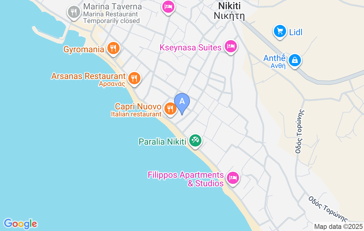 After passing the traffic lights at the entrance to Nikiti, continue ahead until you see the church on your right. Turn right and drive ahead towards the beach. Then turn left and drive for about 250m until you reach this accommodation.