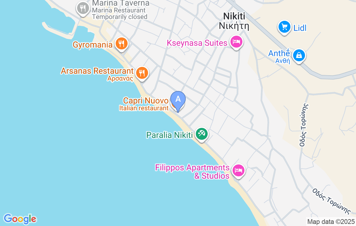 After passing the traffic lights at the entrance to Nikiti, drive straight until you see a church on the right side of the road. Turn right there and drive until you break out onto the city beach, then turn left. Drive straight about 200m, when you see the cafe Vertigo, you will know that you have reached Stella accommodation.