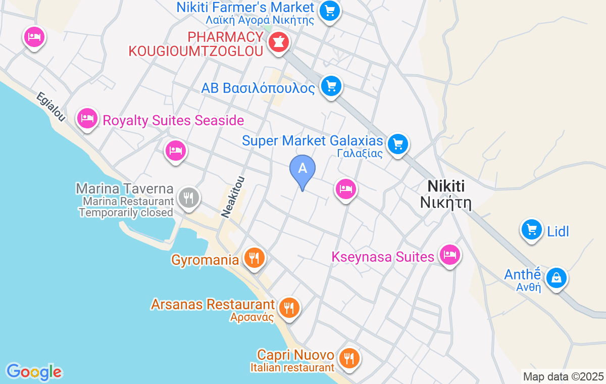 As a well-developed resort, Nikiti is well-served with large supermarkets like Lidl, pharmacies, and bakeries. A special attraction is the local Friday market, where visitors can find fresh regional products, including the famous honey the area is known for. Its strategic location at the gateway to the Sithonia peninsula makes it an excellent base for exploration. From here, you can easily reach some of the most beautiful beaches on Sithonia’s western coast, such as Agios Ioannis, Koviou, Kalogria, and Spathies—ideal for discovering the hidden gems of Halkidiki. The accommodation is located 88 kilometers from Thessaloniki International Airport.