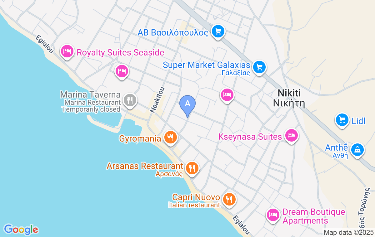 As for its location, Jessi’s Villa is situated in Nikiti, a town divided into the old and new part and one of the most visited and developed resorts on Sithonia. The new part stretches along the coast and is famous for its beautifully designed promenade lined with modern bars, restaurants, pastry shops, and tavernas, as well as various amenities for children. The town beach is clean, well-maintained, mostly sandy, and particularly suitable for families with young children due to its shallow waters. Nikiti is a relatively new tourist destination with a large number of newly built rental properties and is home to about three thousand permanent residents. The old part of Nikiti, located uphill about two kilometers from the beach, exudes traditional charm with its stone houses and cobbled streets. There you’ll find the Church of Saint Nikitas and many authentic tavernas. Nikiti is also known for the Sofronios Basilica from the 5th century, one of the oldest Christian churches in the region of Macedonia. Nature and food enthusiasts can explore local wineries, visit the open-air market held every Friday, and enjoy the rich variety of local honey, as Nikiti has been a major honey-producing center in Europe for over 600 years. The area surrounding Nikiti is home to some of the most beautiful beaches in Sithonia, such as Koviou, Kalogria, Spathies, Elia, and Karidi. Thanks to its convenient location, Nikiti is the perfect base for exploring both the western and eastern coasts of Sithonia. Just two kilometers from the center, the main road splits, providing quick access to both sides of the peninsula, where visitors can discover secluded coves, picturesque fishing villages, and lush pine forests. The nearest airport, Thessaloniki’s Macedonia Airport, is about 80 kilometers away, making travel to and from the villa easy and efficient for both domestic and international guests.