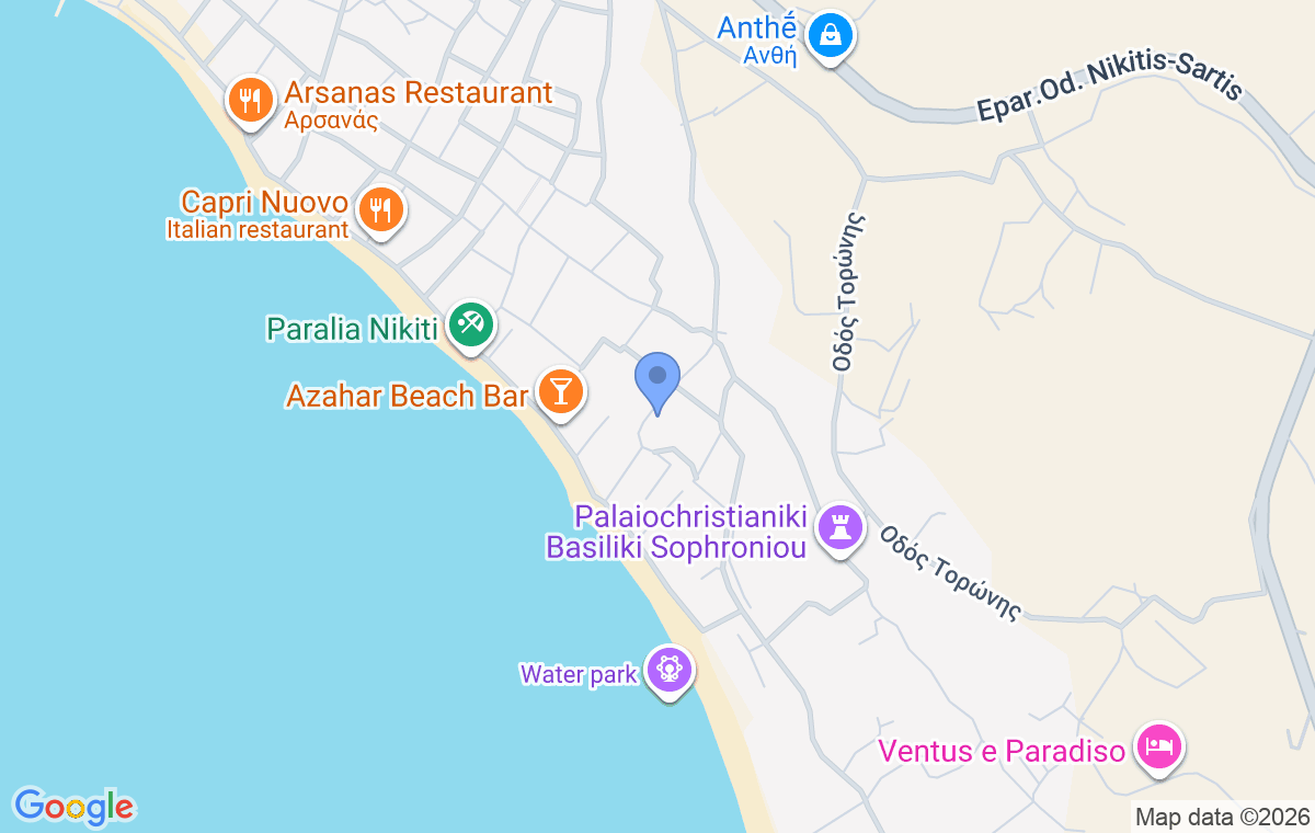Nikiti offers its visitors a variety of amenities and a pleasant atmosphere that suits both those seeking a peaceful holiday and those who enjoy exploring the surroundings. The long sandy beach with clear sea is perfect for spending the whole day by the water, while the well-arranged seaside promenade offers a wide selection of tavernas, restaurants, and cafés where visitors can enjoy local specialties and a relaxed Mediterranean atmosphere. This seaside village also features numerous shops, bakeries, markets, as well as a local market where visitors can find fresh fruits, vegetables, and homemade products typical for this region. Nikiti is an excellent choice for a relaxing seaside holiday, but also a perfect starting point for exploring Sithonia and its natural beauty. From this village, it is easy to reach some of the most beautiful beaches of the peninsula, as well as picturesque villages and hidden coves along the coast. Its location also makes it very convenient for travel and excursions – Thessaloniki Airport is about 90 km away, the popular resort of Sarti is around 44 km away, while Toroni is approximately 41 km away. This accessibility allows guests to easily explore different parts of Sithonia and fully experience its natural beauty and authentic charm.