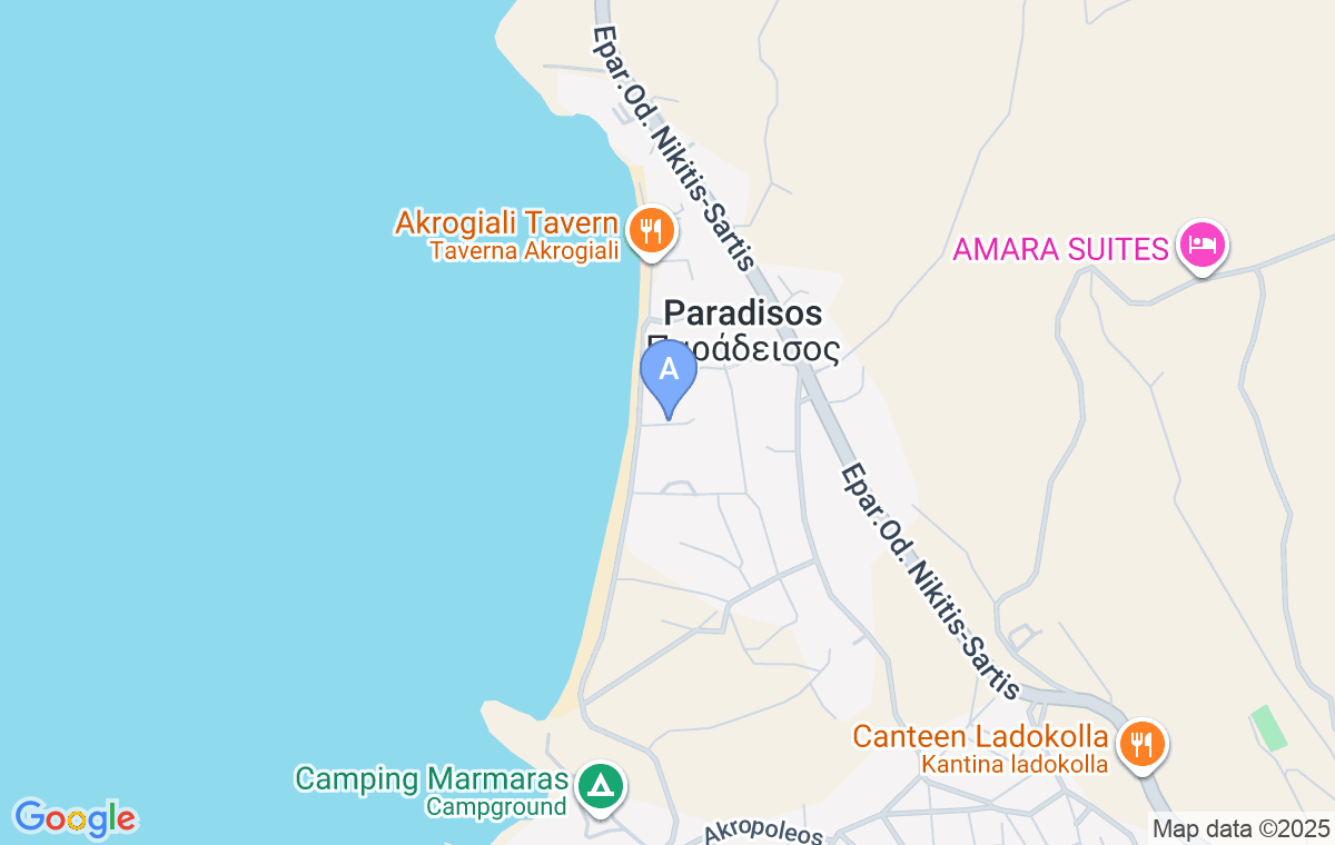 The accommodation is easy to find, it’s located in the central part of Paradissos beach, in the first row to the sea.
