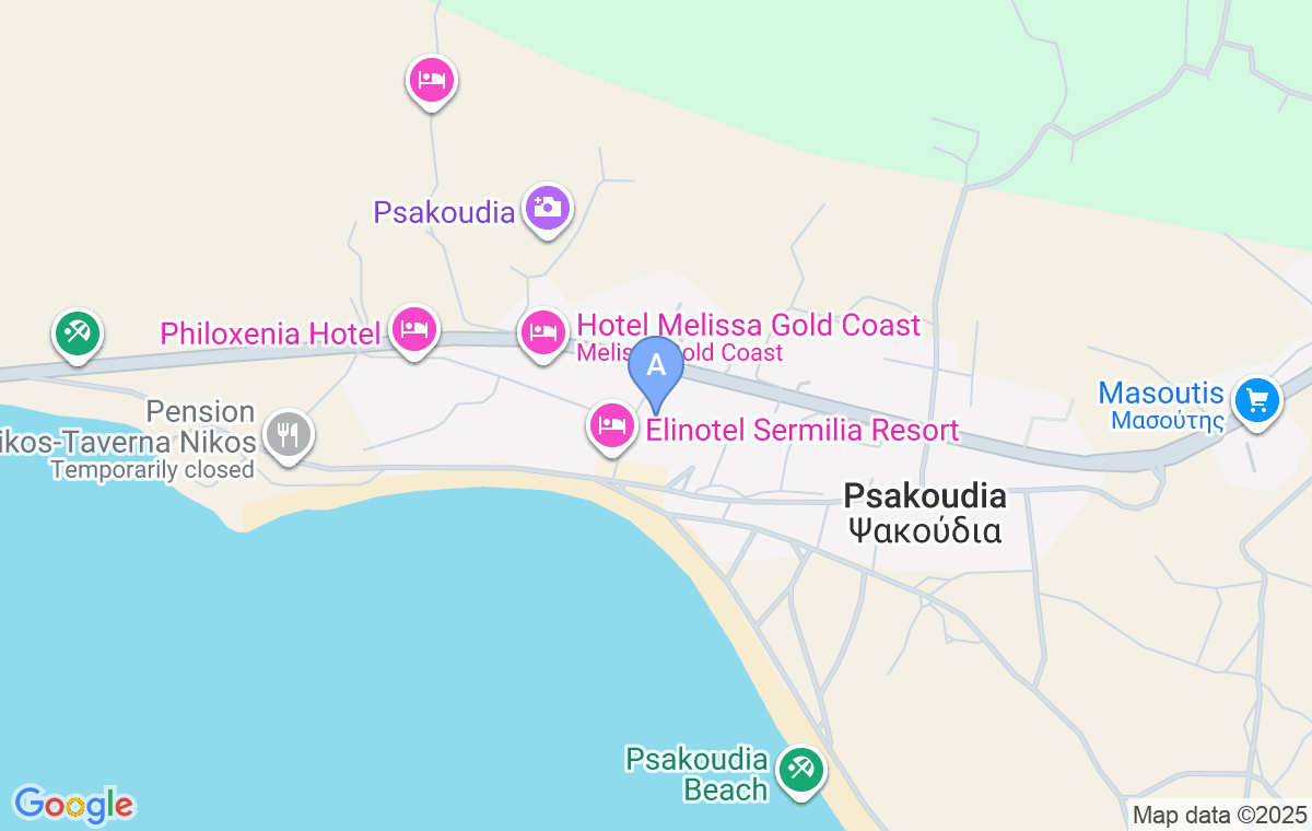 The accommodation is marked on the map, so you can hardly miss it. Coming from the direction of Nea Mudania, do not enter Psakudia at the first right turn, but continue straight. As soon as you pass the Melissa Gold Coast Hotel, turn into the first street on the right, then after about 70 meters, turn into the alley on the left and you will see the accommodation on the left.