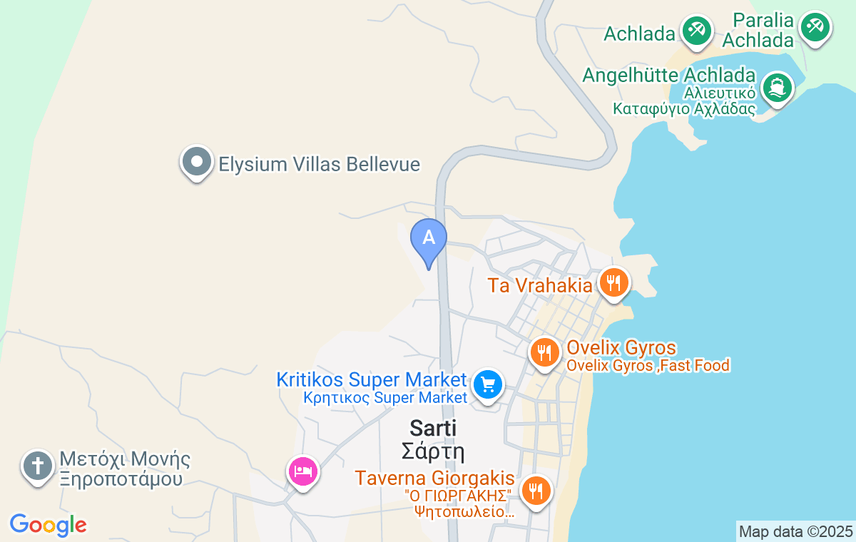 After entering Sarti, continue straight on the main road and after 160m you will see this accommodation on the right.