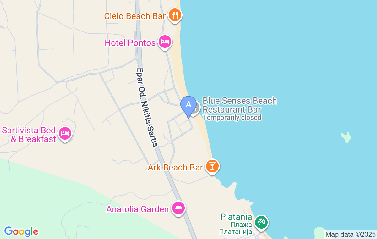 After entering Sarti from the north, continue along the main road to Sikia for about 2km and turn right at the eighth exit. Take the street for about 200m, then turn right and after 180m you will see a hotel on the right.