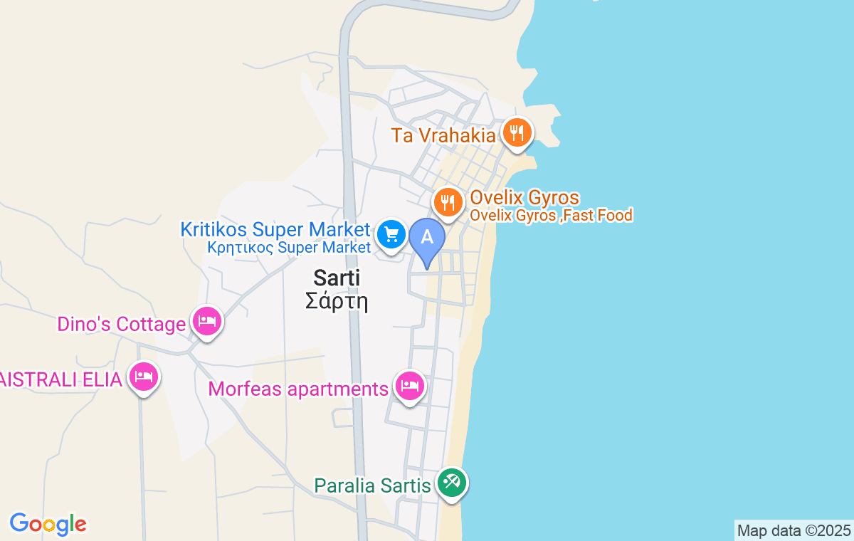 To reach the accommodation, the easiest way is to turn from the main road Sarti-Sikia towards the large supermarket Kritikos, pass the parking lot, turn right, and then turn left into the first street. On the left side, you will see Chrysoula Mitsokopi House.