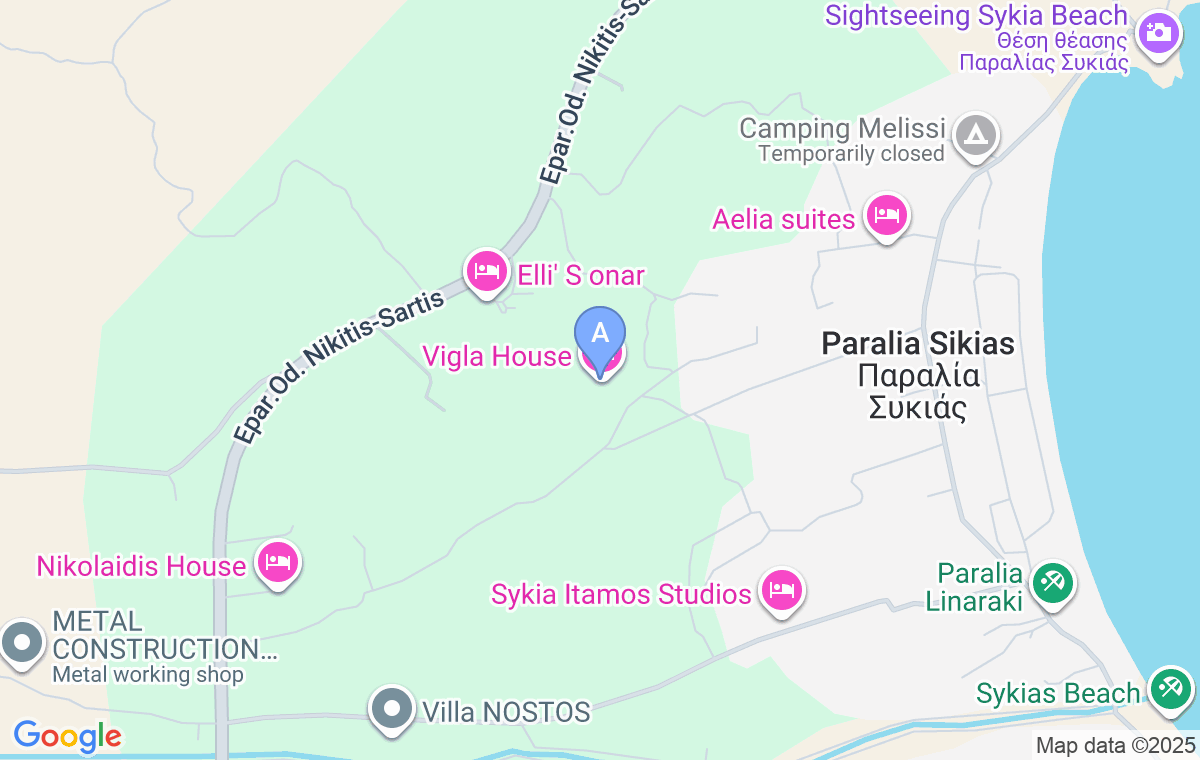 In order to reach Vigla House, you have to take the dirt road from the main street next to the beach Sykia. After you turn towards the beach Sykia, continue straight until you reach the beach. Then continue straight (actually left) until you see the tavern Theano on the left. Continue straight and turn in the second street left. When you come across the crossroad, turn right and you will see the house.