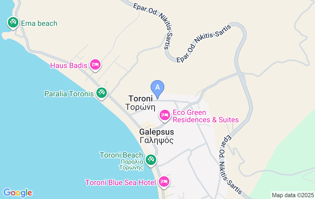After entering Toroni, follow the street along the beach and take a right after the Acapus Bar. After 230m you will reach Tsamakdas House.