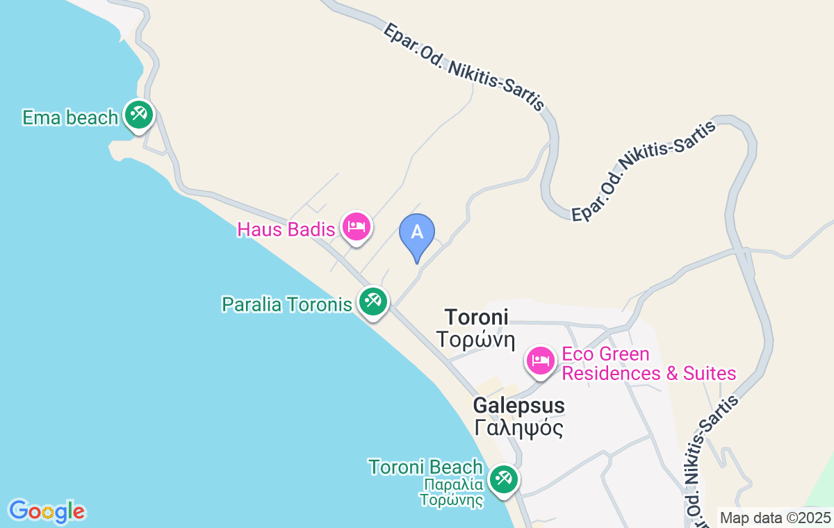You can reach the accommodation by driving down the main street by the sea. When you pass the mini market Smile, you will drive another 200m and turn into the second street to the left (counting from the Smile market). After 50m you will see Toroni Luxury Villas.