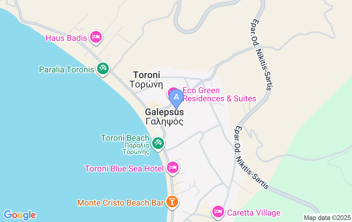 To reach the accommodation, drive along the main street next to the sea until you reach the children’s playground after Taverna Afroditi (coming from Nikiti). At the playground, turn into the first alley and continue driving until the end, where you will spot the accommodation.