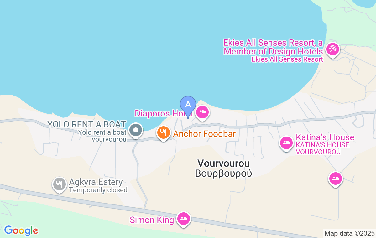 Alexander Villa is located on the beach in the village of Vourvourou, on the eastern coast of the Sithonia peninsula. Vourvourou is unique in that it is close to an archipelago of nine islands, the largest of which is Diaporos. In this sense, it offers something that no other place in Sithonia offers - renting a boat and going to the island of Diaporos, bathing in coves with turquoise water, and enjoying the view of the blue lagoon.