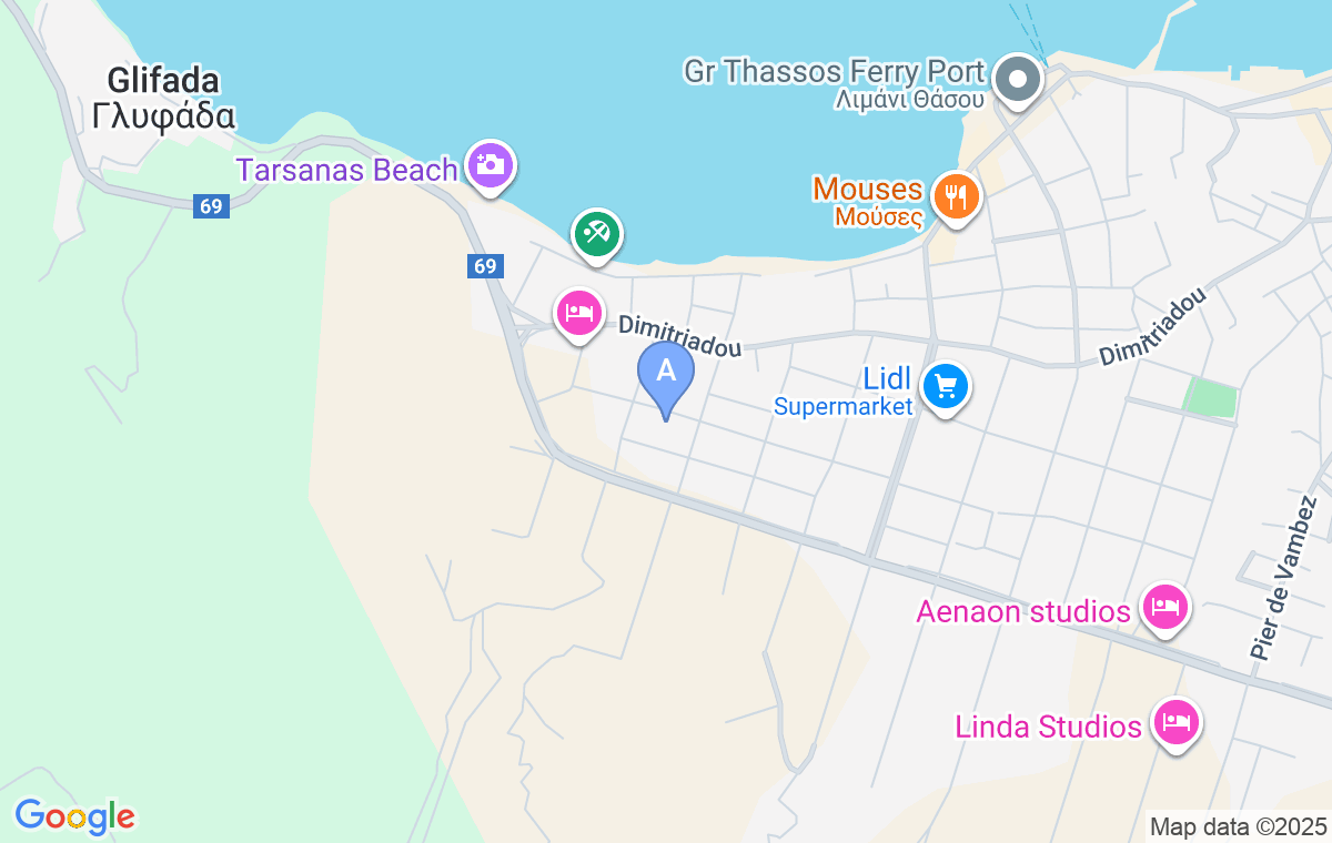 When you exit the ferry, follow the direction and drive right by the sea on the main road (300 meters), then you’ll get to the part where the narrow path leads straight to the Vournelis hotel and the eponymous beach, and you’ll follow the main road and turn left, then after about 150 meters you will reach the first major intersection (with Dimitriadou Street) and turn right there. On the left side you will see narrow streets that are separated from the road, there are few, and to come to the villa Mary Ann you should turn into the fourth one. In about 150m from the turnoff to the left you`ll see the villa.