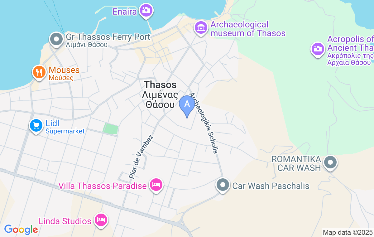 When leaving the ferry, follow the direction to the right and drive along the sea by the main road (about 300 meters). When you come to the part where the shortcut straight leads to the Vournelis Hotel and the beach of the same name, you follow the main road and turn left. When you reach the first big intersection (with Dimitriadou Street) after about 150 meters, continue straight (about 350 meters) until the next large intersection (with Thassos - Prinos). Turn left there, then after some 650 meters turn left again (fifth street left) into Pier Mie Vampez Street, where you will see the Antigone Hotel after 500 meters on the right. After the Antigone Hotel, turn right onto the second street and continue straight ahead, where after about 100m you will see the Galaxy Hotel on the left.