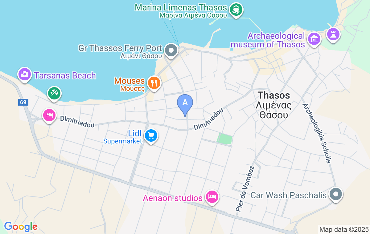 The accommodation is situated in the main town of Thassos, Limenas. It stands out with its peaceful location, being 170m away from the nearest supermarket, 300m from Lidl and Masoutis, 350m from the port, and about 700m from the city center.