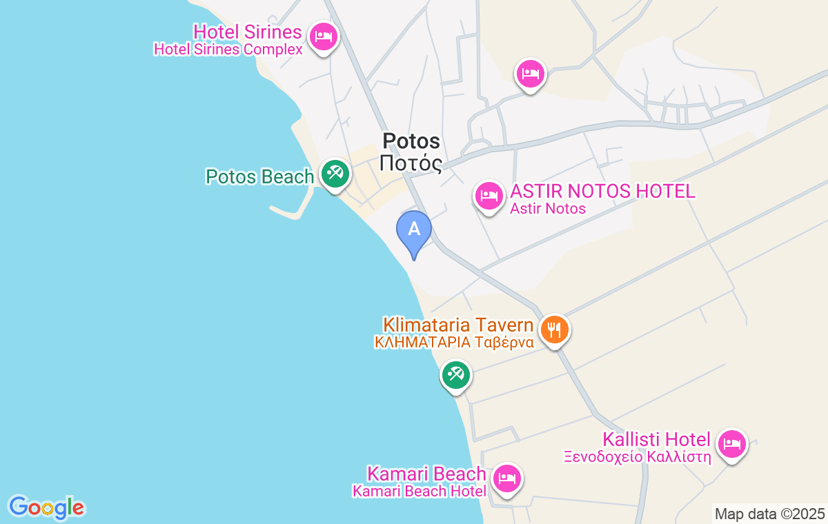 When coming from Limenaria, pass the central intersection in Potos and continue straight for about 100m. Right before the Anna’s Star hotel on your right side, you will find Crystal Blue Apartments.