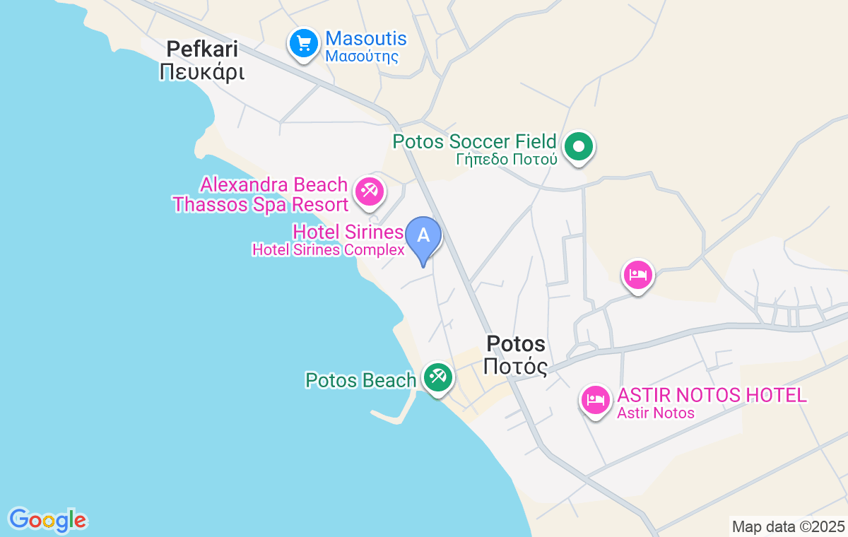 As you enter Potos from Limenaria, you turn onto the first street to the right immediately after the Alexandra Beach Hotel. The street leads obliquely towards the sea. The Sirines Hotel is the first on the right side of that street, across from a small children’s park and Southern Cross is right next to you. There is a doctor in the same ground floor house.
