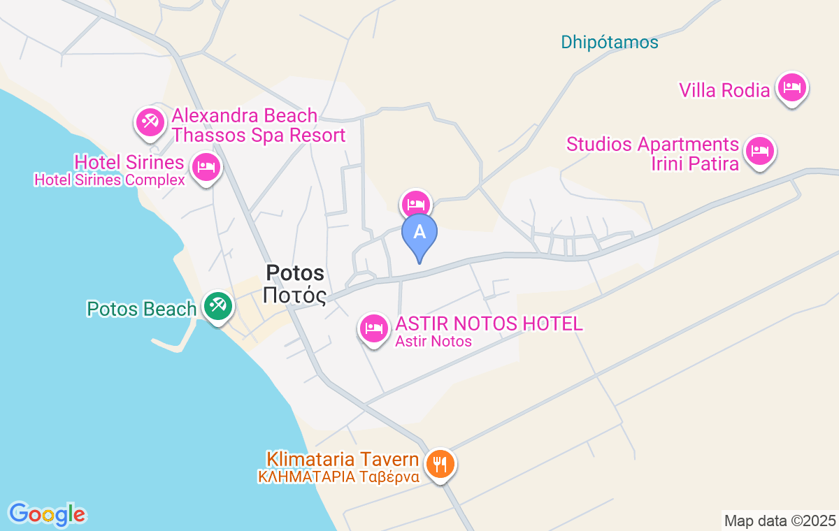 At the central intersection in Potos, turn left towards Theologos. After 300m, you will see the house on the left side of the street, across from Villa Athina, immediately after Villa Dusseldorf.