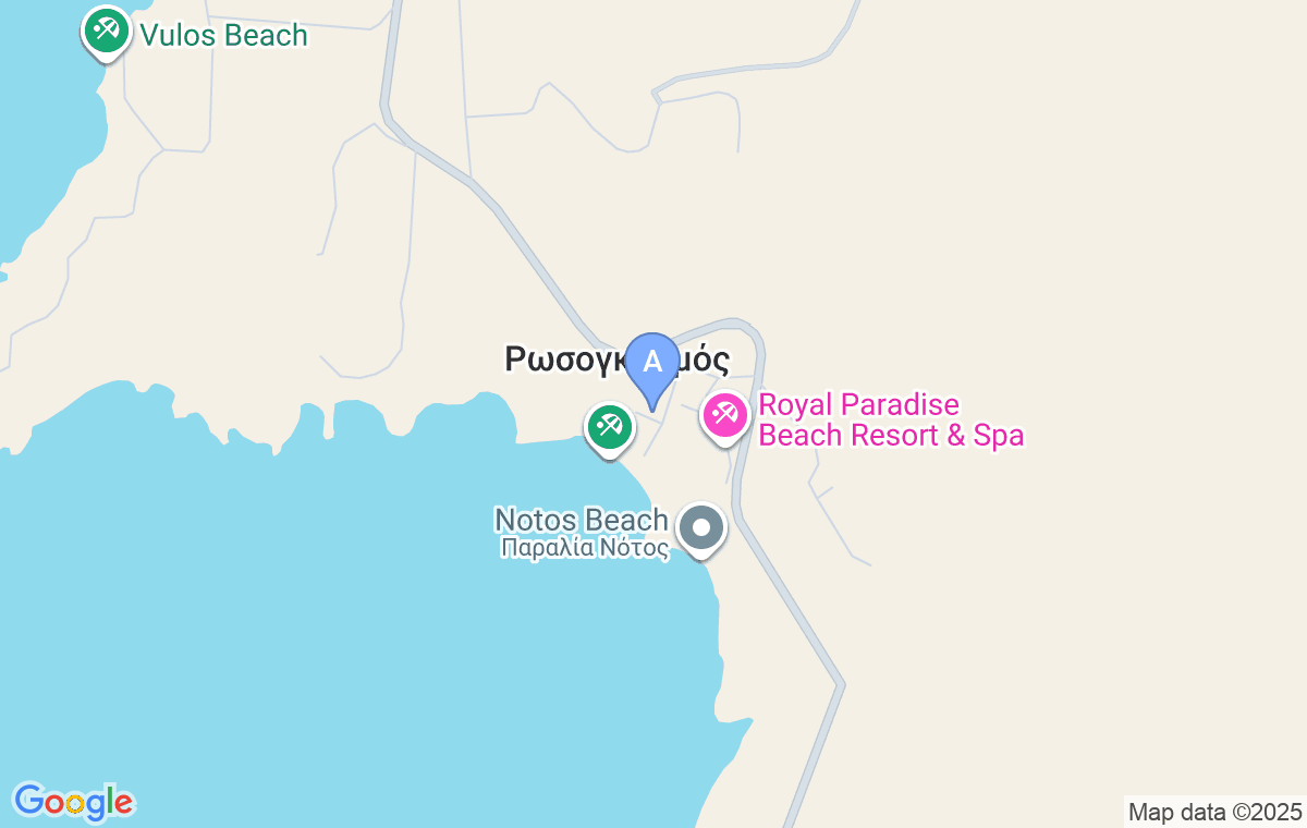 Roso Gremos beach is beautiful, surrounded by pine trees. By the utmost left part of the beach was built a 5-star hotel The Royal Paradise Beach Resort & Spa, while the middle and the right part are still free to use and set up towels and umbrellas. The beach is sandy and the water is ideal for children, with shallows and gradual depth.