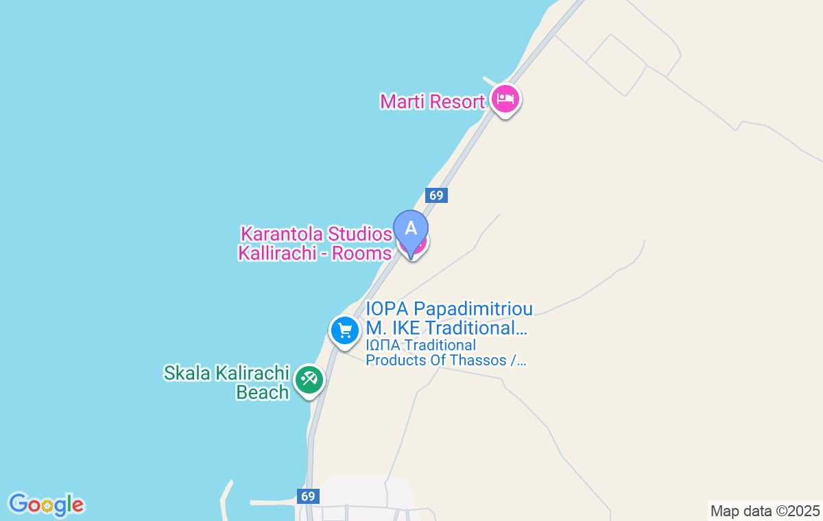 Karantola Studios is located in Skala Kalirachi, just 30m from the beach. The nearest store and bakery are about 1km away.