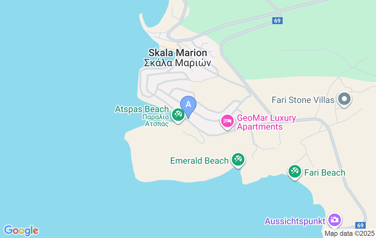 Vila Thalassorama is located at the entrance to Skala Maries, in non-traffic street, in a fantastic location, just above the beautiful Astpas (Sugar) beach. You can enjoy lovely sea view from you balconies.