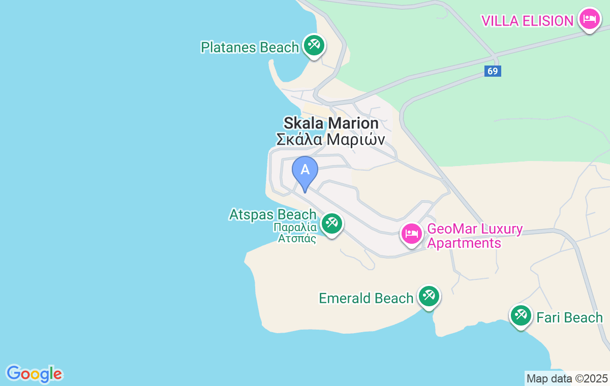 Coming from Prinos,take a right turn at the sign for this beach, on the exit from the place. Keep driving next to the sea and about 170m after the Porto Gatos cafe, you will find Mandy House.