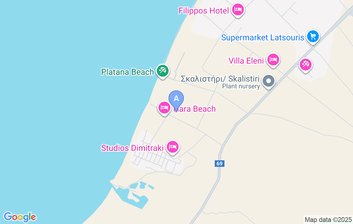 Accommodation is in the small place, Skala Rachoni, 100m from the beach. The closest market is at 1,3km (Latsouris).