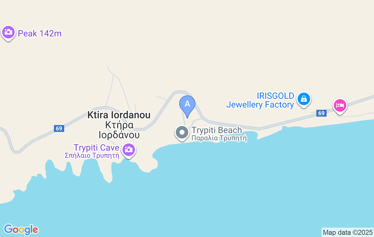 When arriving from direction of Prinos, 5km after Skala Maries, you will see Hotel Blue Dream Palace, then Tripiti bungalows and after a curve one right turn at the road leading to the beach. After you turn you’ll see two villas on the right side of the dirt road, surrounded by pine trees in a big yard.