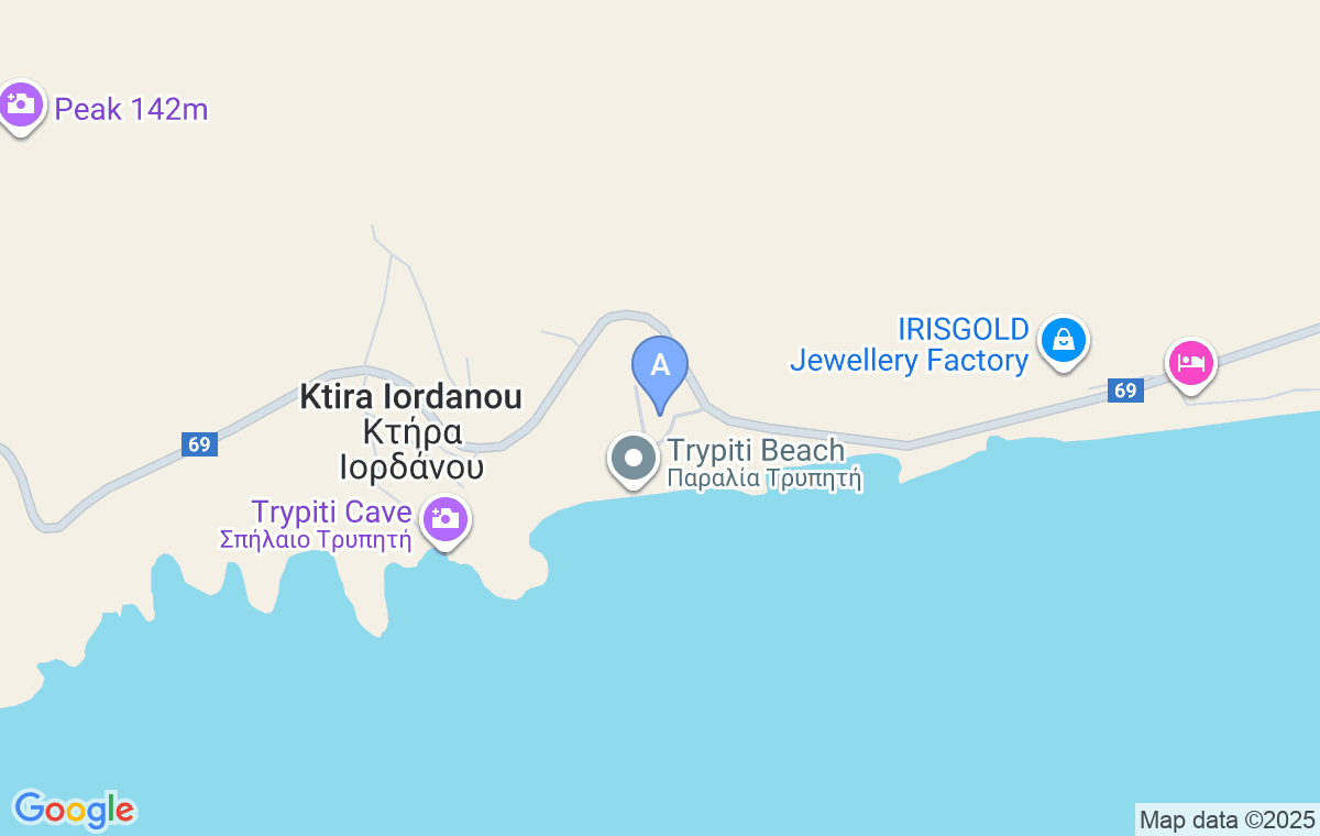 Coming from Prinos, 5km after Skala Maries, you will see Hotel Blue Dream Palace, then Tripiti bungalows and after a curve one right turn at the dirt road leading to the beach. After you turn you`ll see the mansion on the right side of the dirt road, surrounded by pine trees in a big yard.