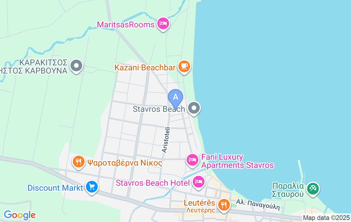 After entering Stavros, drive the main road toward the large STIHL equipment store on the left, turn to the left and drive till the end of that street. Turn to the left and drive for another 30m towards the church under construction, then turn to the right. Drive straight ahead for about 450m until you reach Rihios Hotel on the right-hand side.