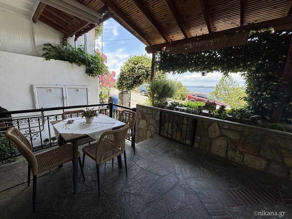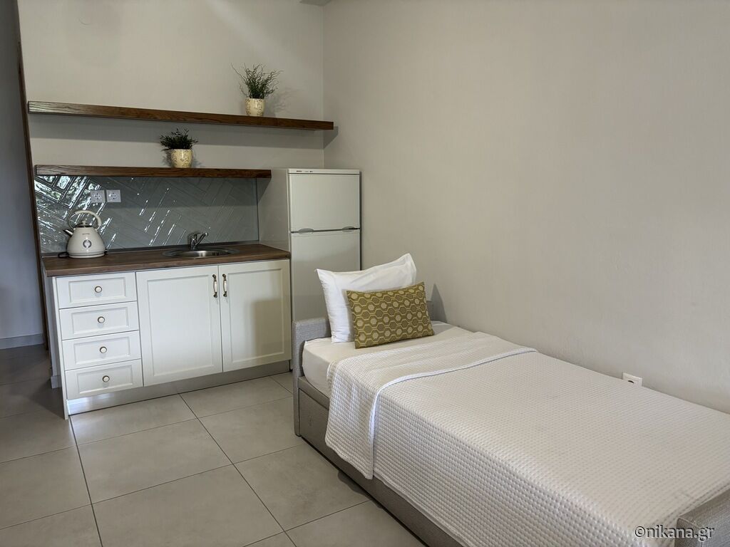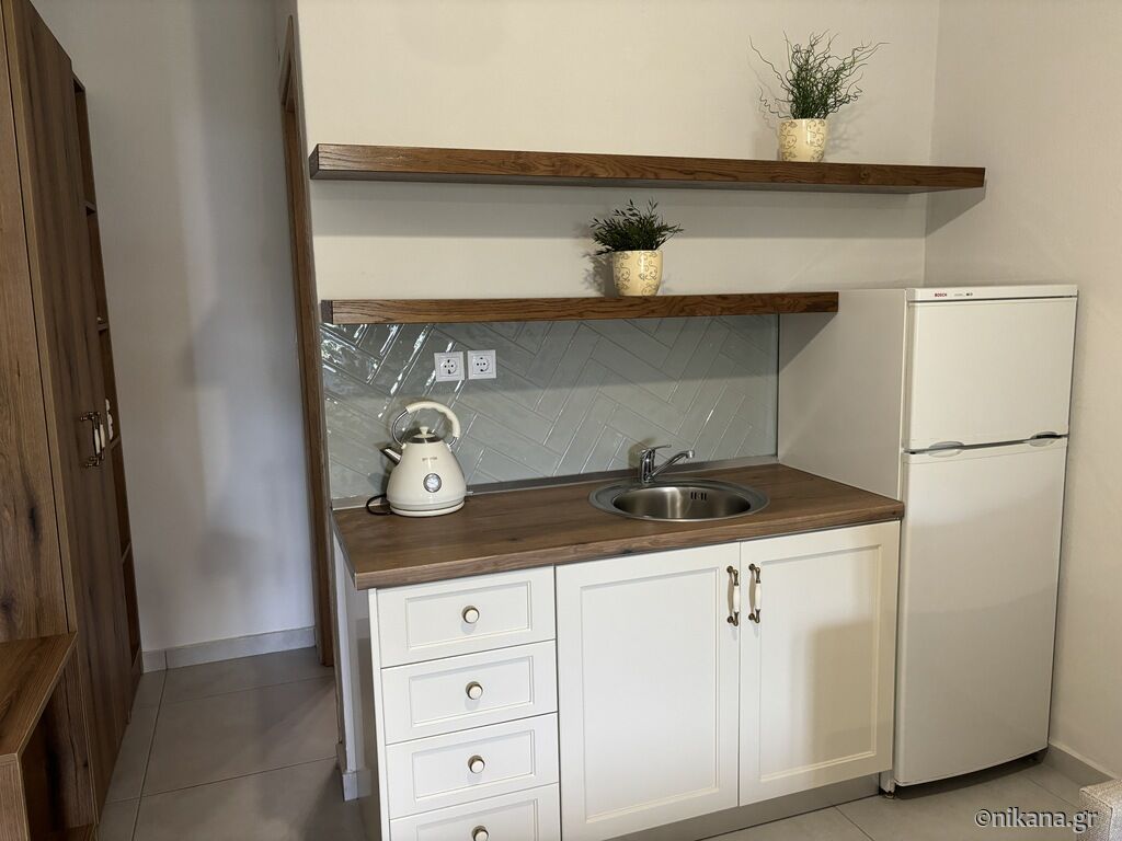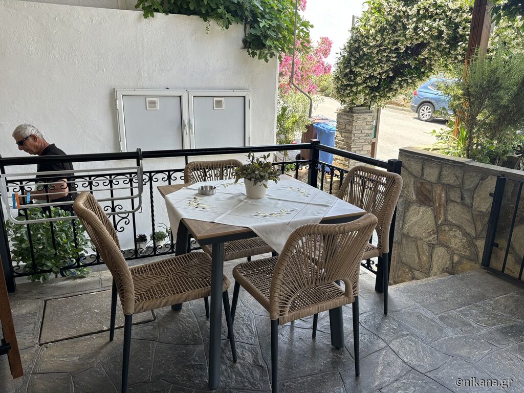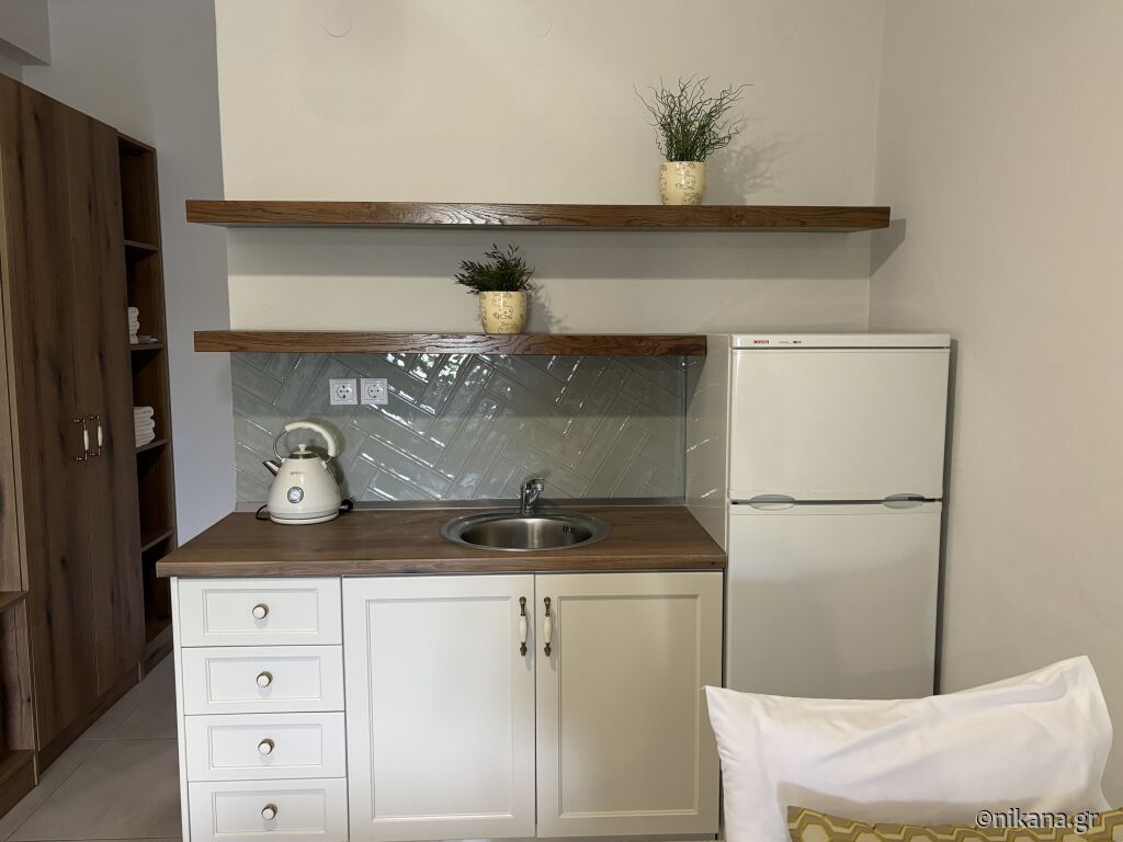 On the third floor (attic) there are two studios. The superior studio (27m2) has two single beds and one single with a drawer bed, so it can host up to four people. There is also an equipped kitchen with a stove and a medium-sized refrigerator with a freezer, a bathroom (shower with a curtain) and a terrace with a brick barbecue. From the terrace there is a great and colorful view of Ouranopolis. The second studio (15m2) has a standard French bed and a slightly larger single bed, an equipped kitchen (mini-stove and large fridge with freezer), a bathroom (shower with a curtain) and a spacious terrace with an incredible view of the sea.