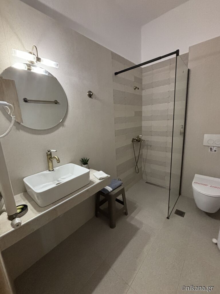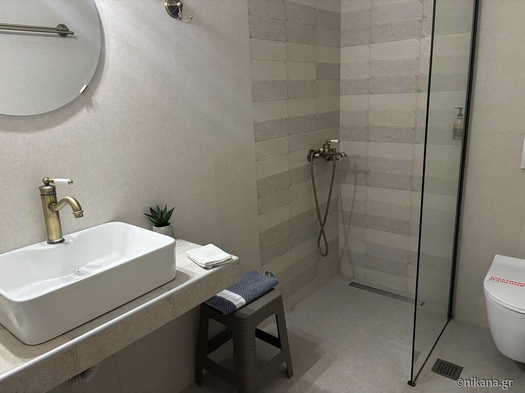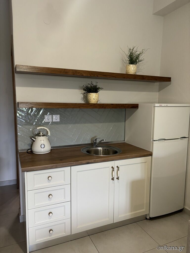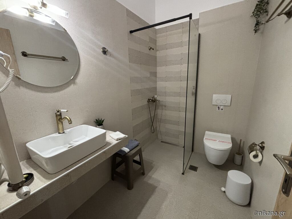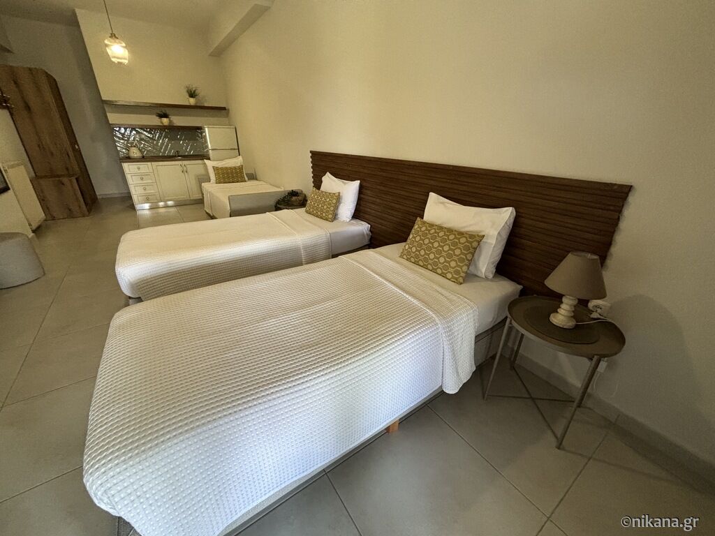 On the third floor (attic) there are two studios. The superior studio (27m2) has two single beds and one single with a drawer bed, so it can host up to four people. There is also an equipped kitchen with a stove and a medium-sized refrigerator with a freezer, a bathroom (shower with a curtain) and a terrace with a brick barbecue. From the terrace there is a great and colorful view of Ouranopolis. The second studio (15m2) has a standard French bed and a slightly larger single bed, an equipped kitchen (mini-stove and large fridge with freezer), a bathroom (shower with a curtain) and a spacious terrace with an incredible view of the sea.