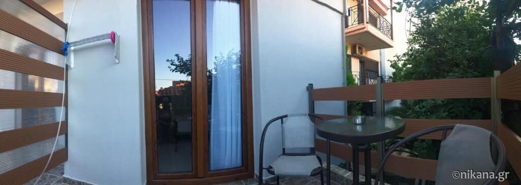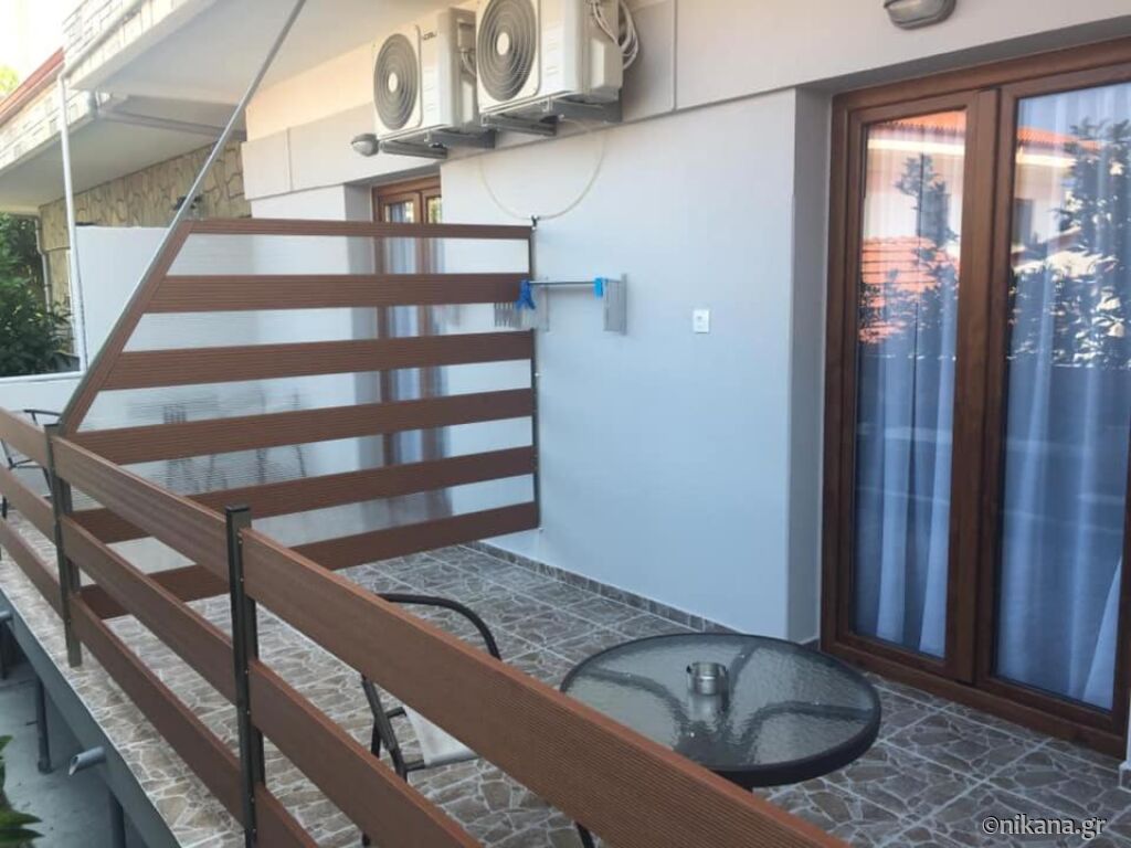 Each accommodation unit has a balcony, and the balconies are spacious, providing enough space for sitting and enjoying the greenery of the small courtyard they overlook. Although the studios are positioned at the back of the building and do not have a sea view, the orientation towards the courtyard ensures quiet, tranquility, and a pleasant atmosphere, especially in the evening.