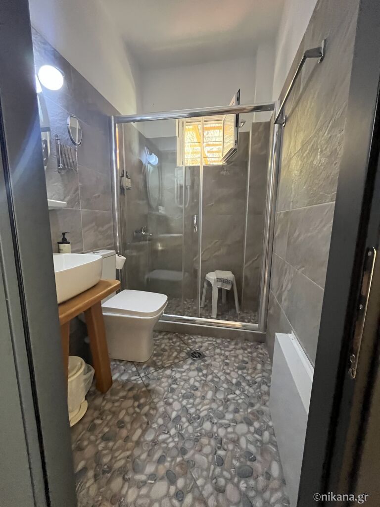 The suite apartment (55m2) comprises a double bed in the bedroom, three single beds and a sofa bed for two children in the living room, and a veranda (20m2) with a magnificent view of the sea and the distant Paxi island.