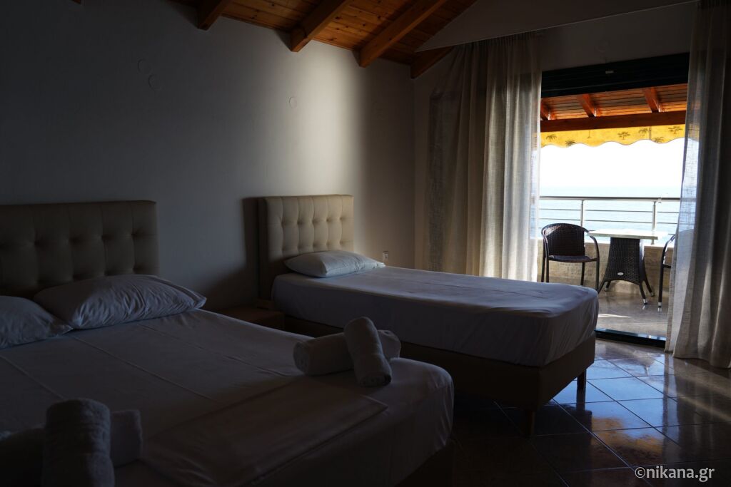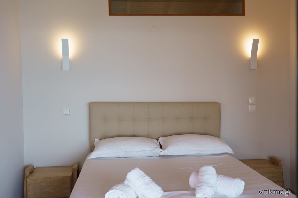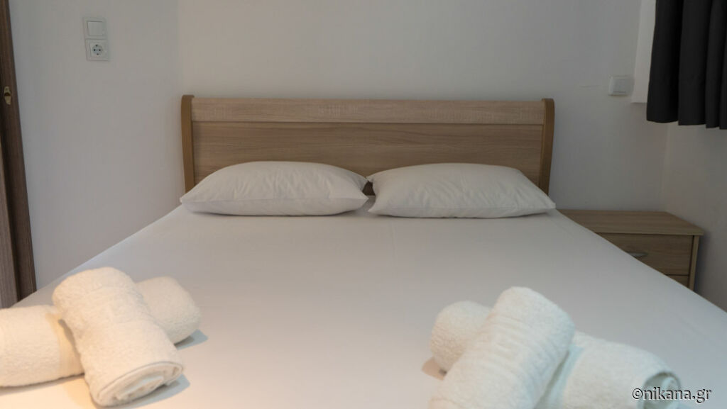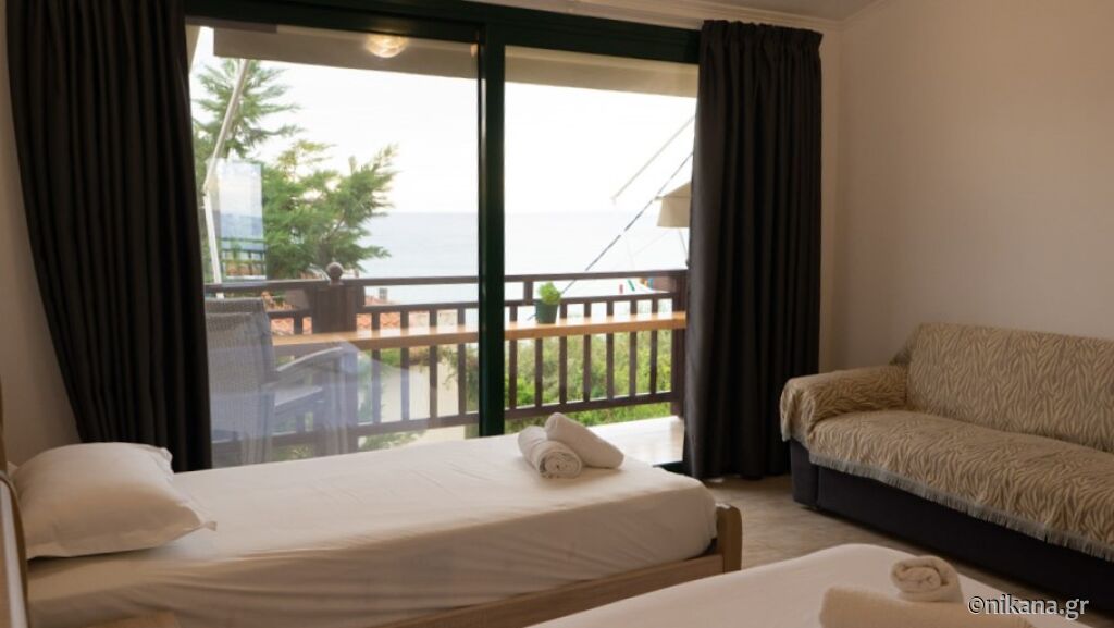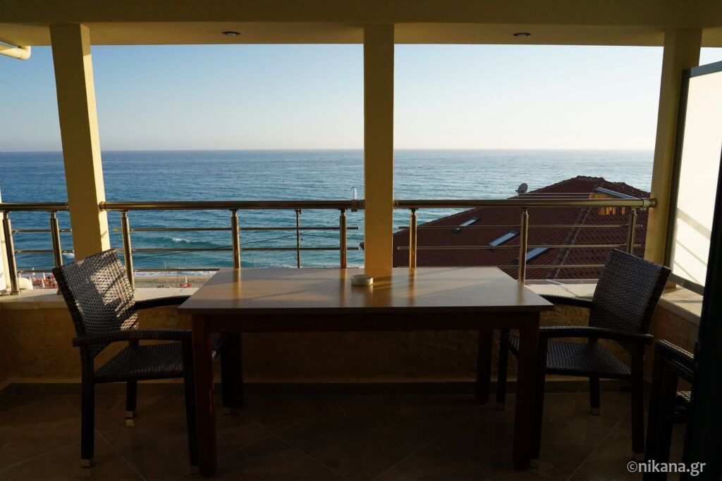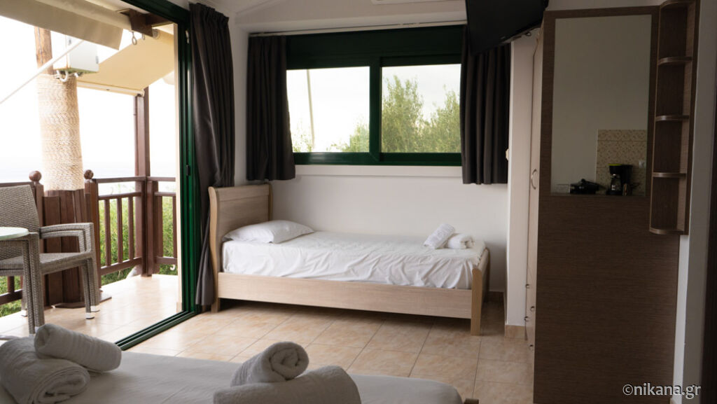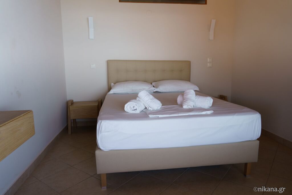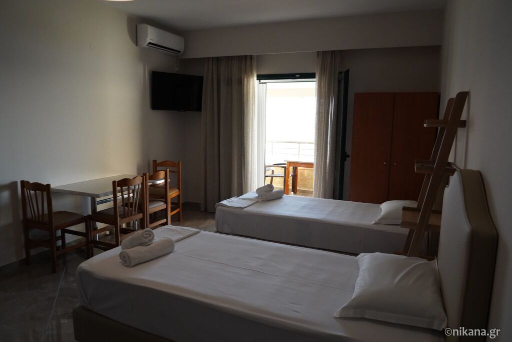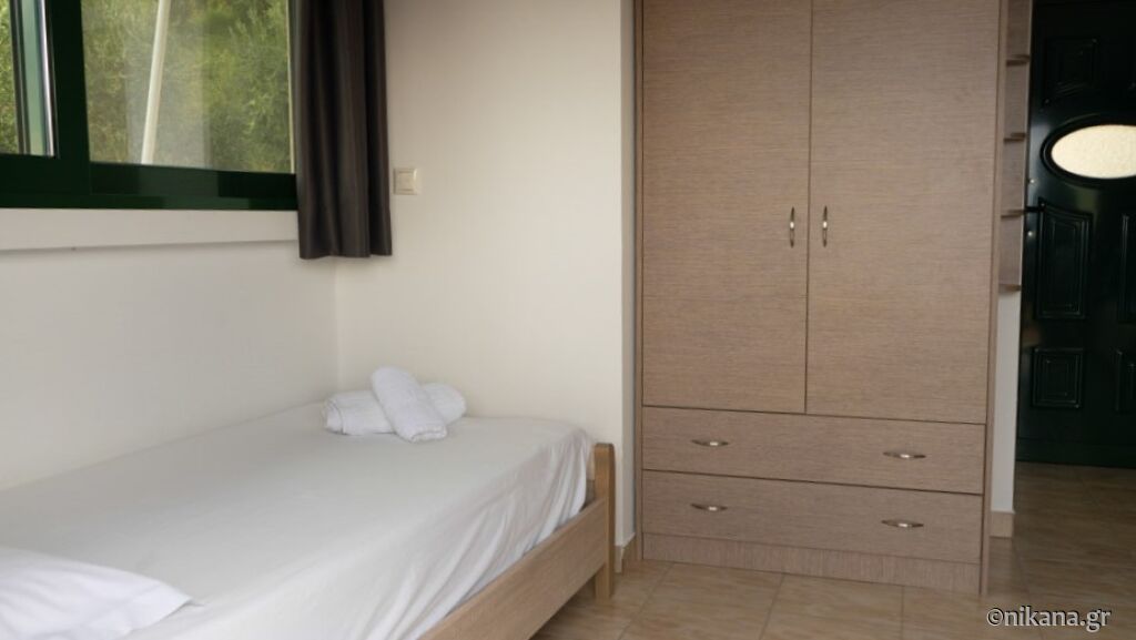 There are also five apartments (45-50m2) with one double bed in one bedroom and two single beds in the other room. Two apartments (no. 4 and 5) have a side sea view (no. 5 has one bedroom, not two), the others have a direct view.