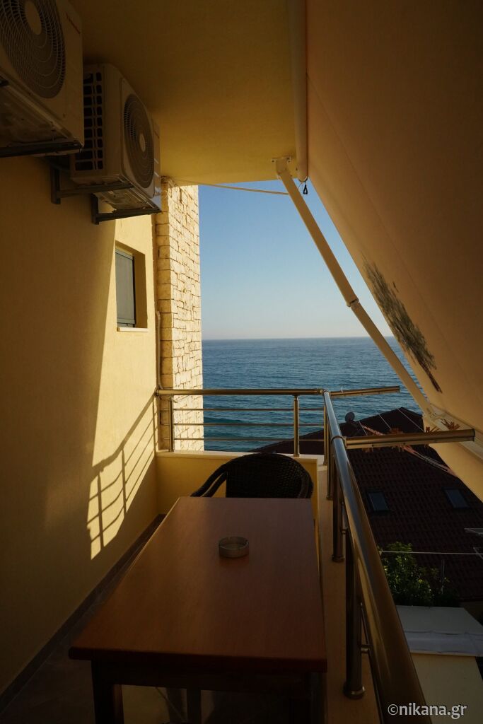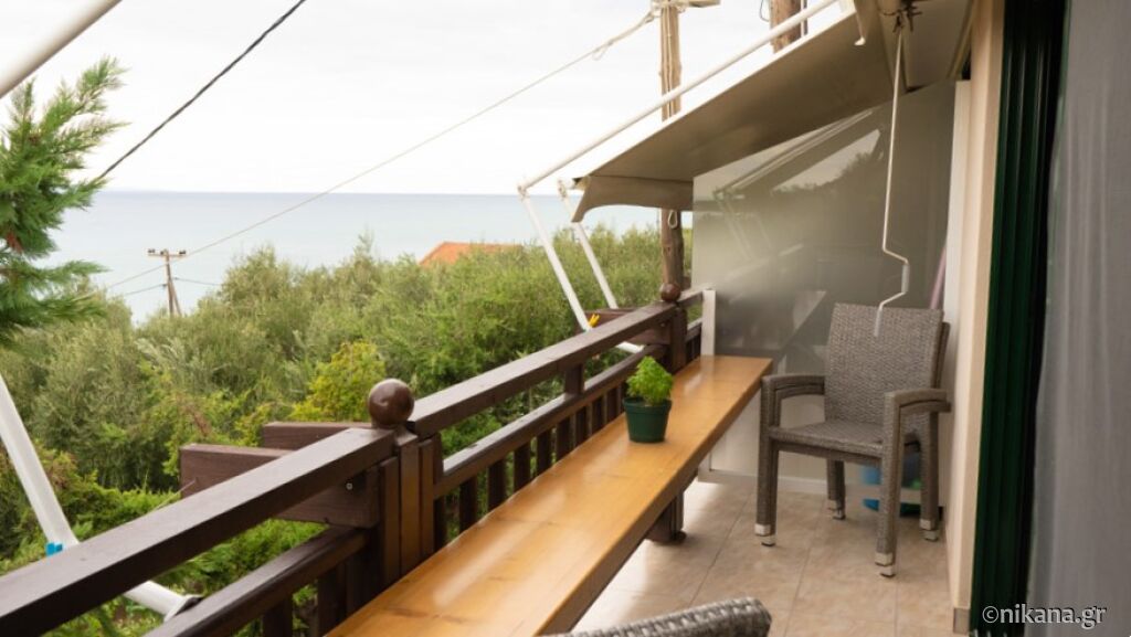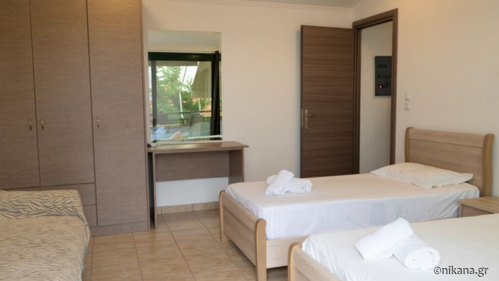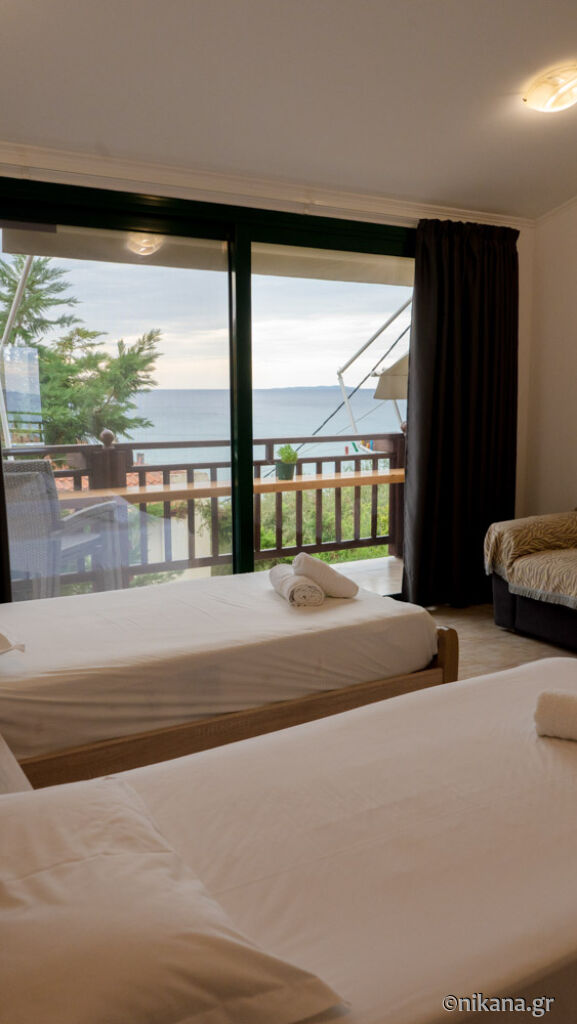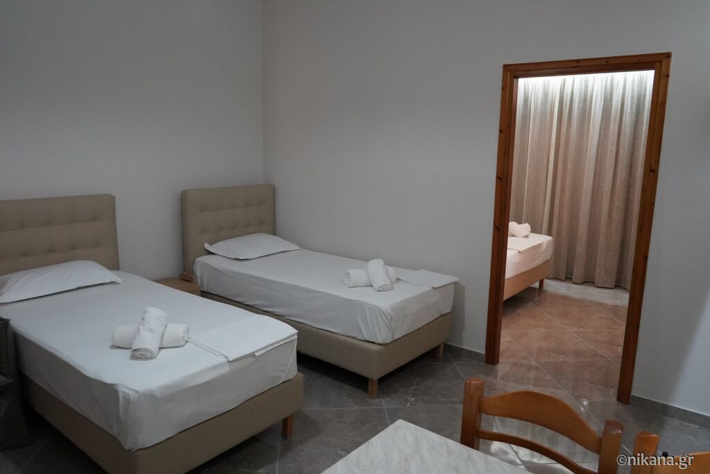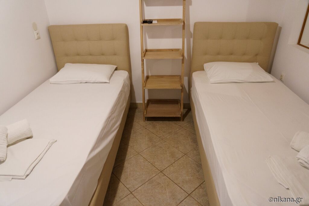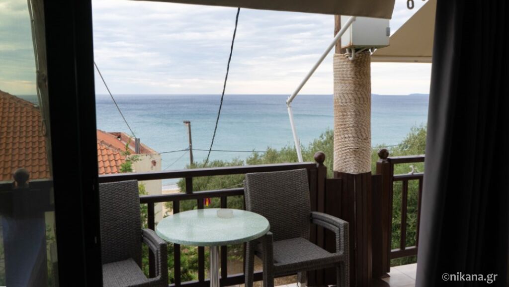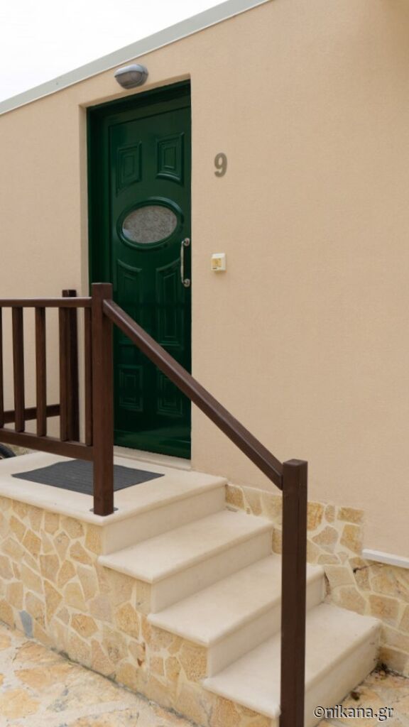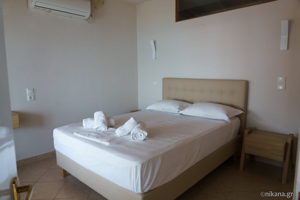 There are also five apartments (45-50m2) with one double bed in one bedroom and two single beds in the other room. Two apartments (no. 4 and 5) have a side sea view (no. 5 has one bedroom, not two), the others have a direct view.