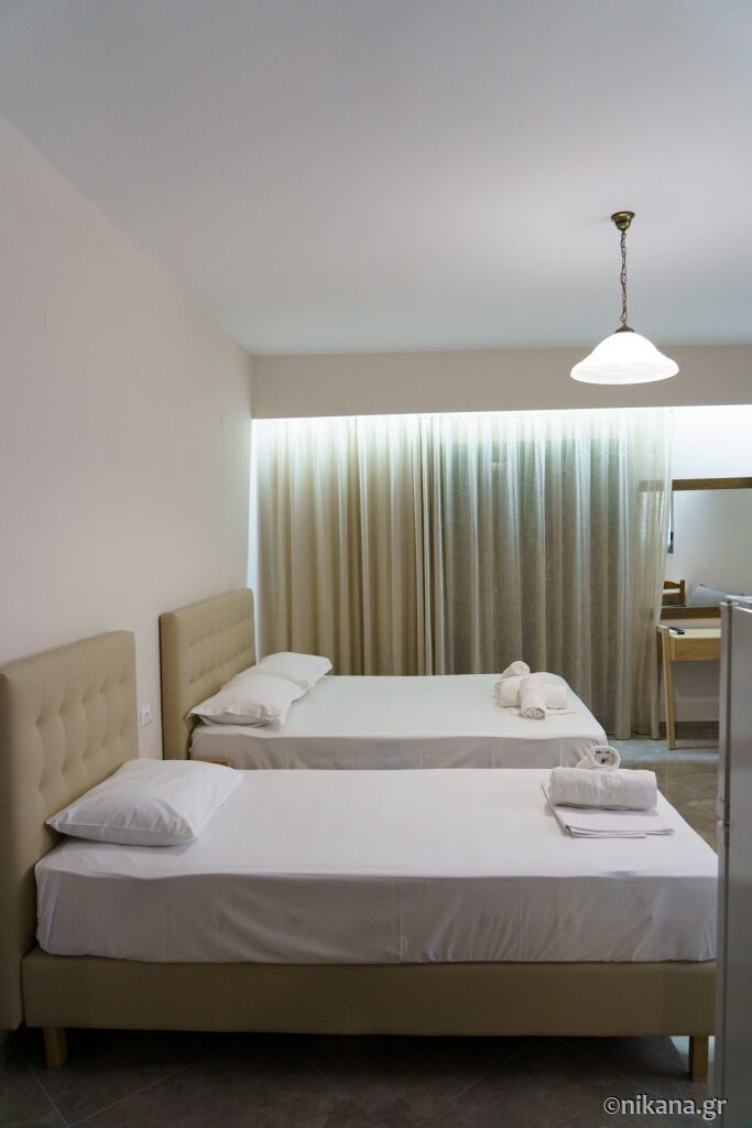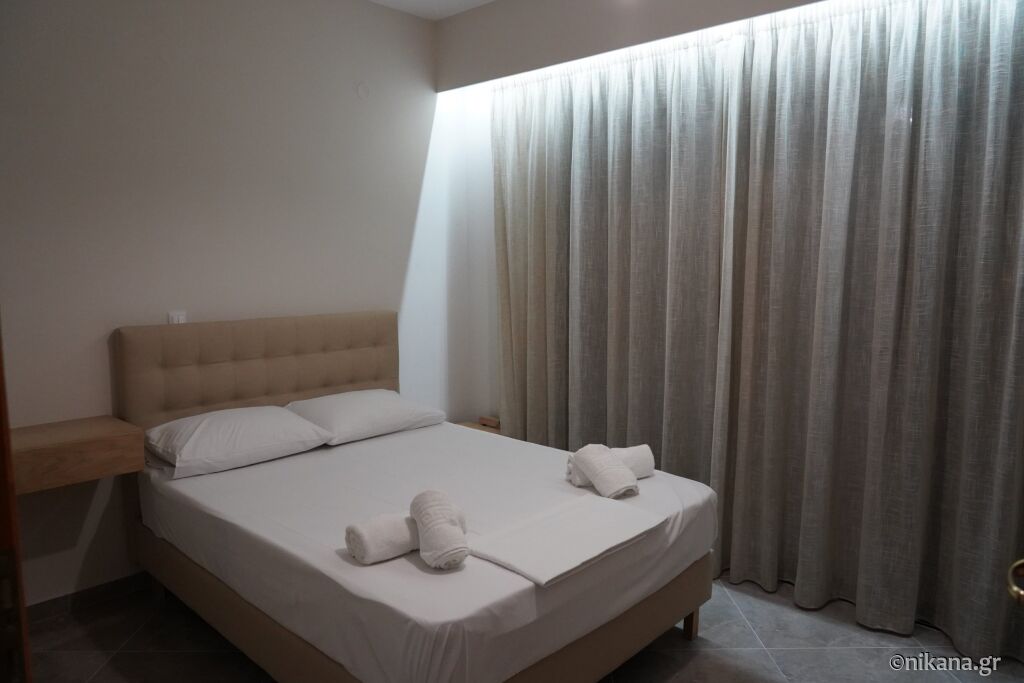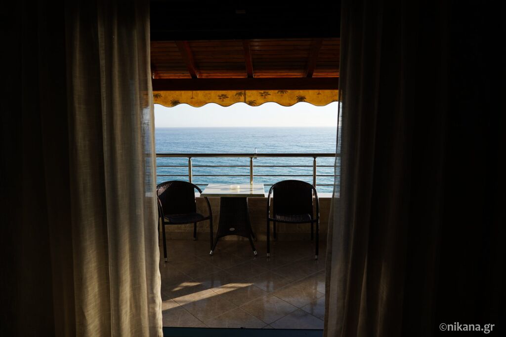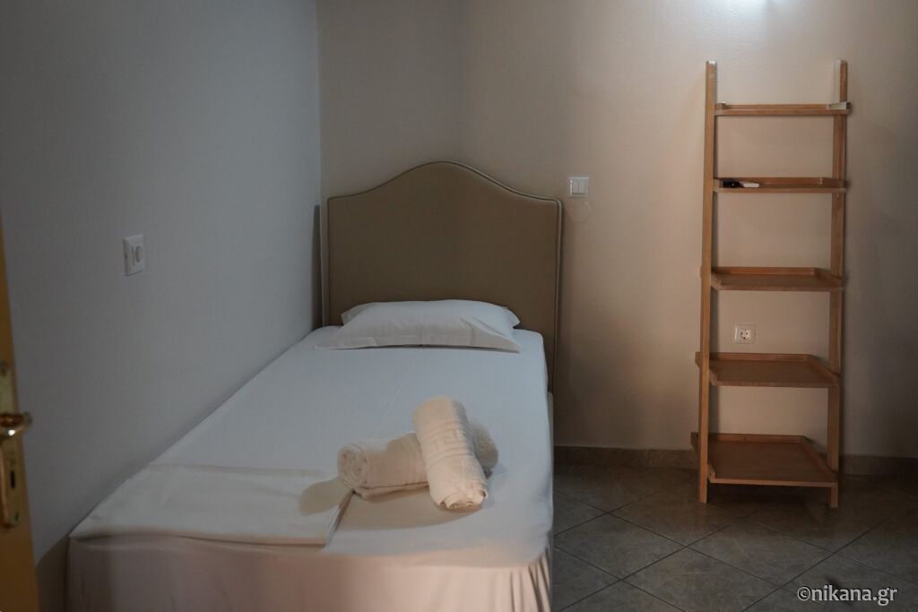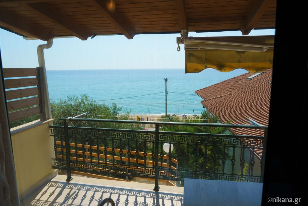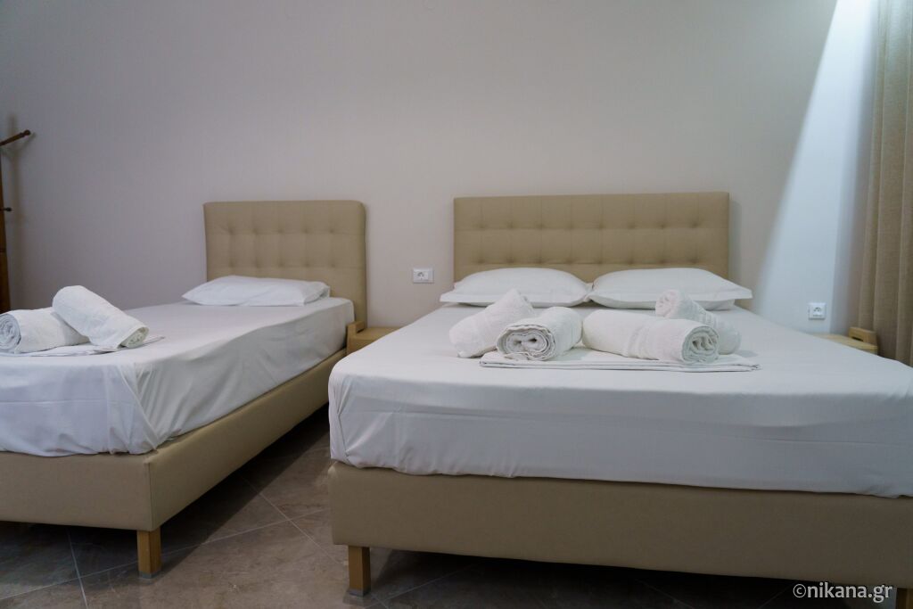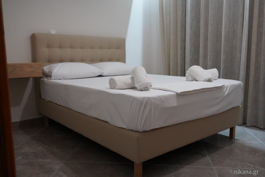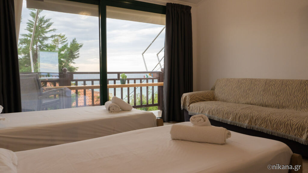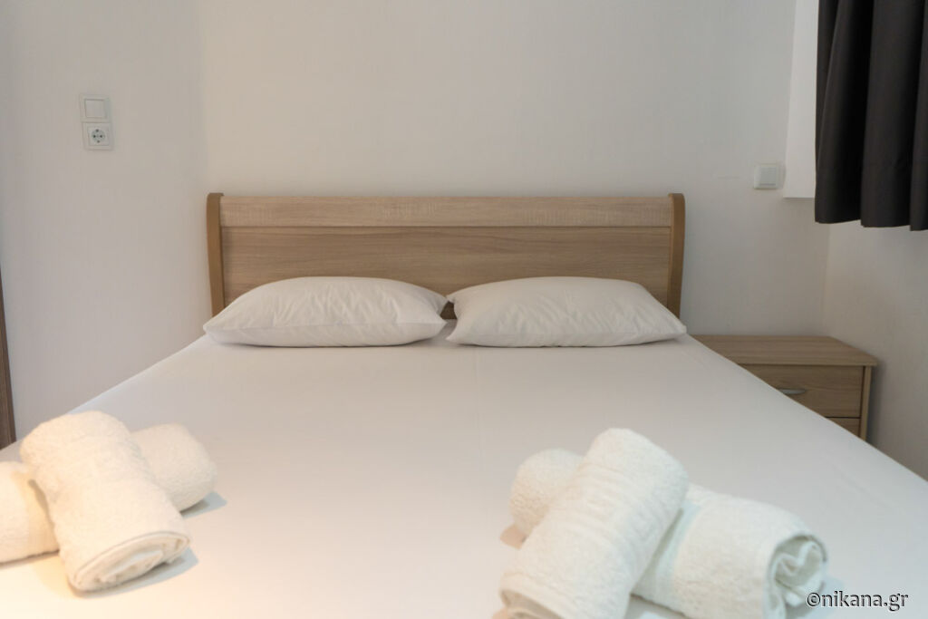 There are also five apartments (45-50m2) with one double bed in one bedroom and two single beds in the other room. Two apartments (no. 4 and 5) have a side sea view (no. 5 has one bedroom, not two), the others have a direct view.