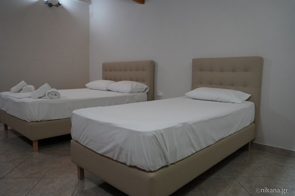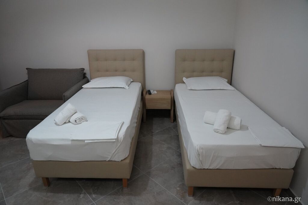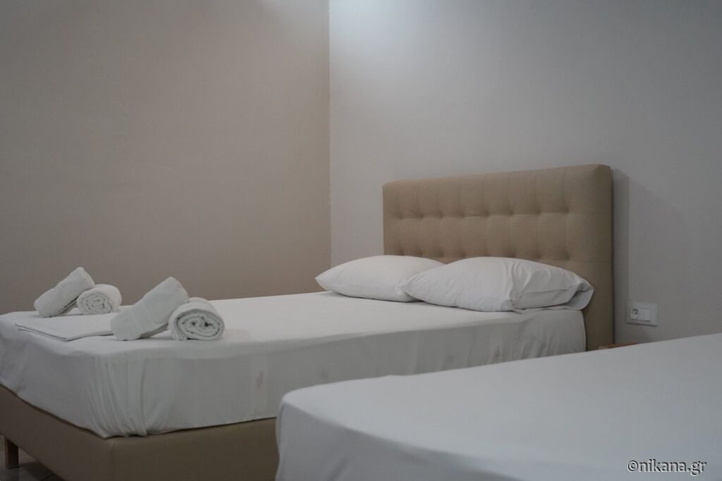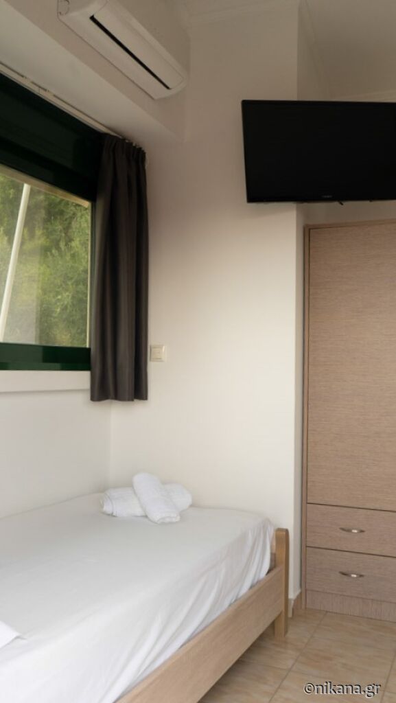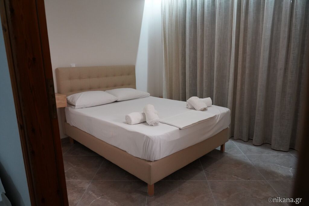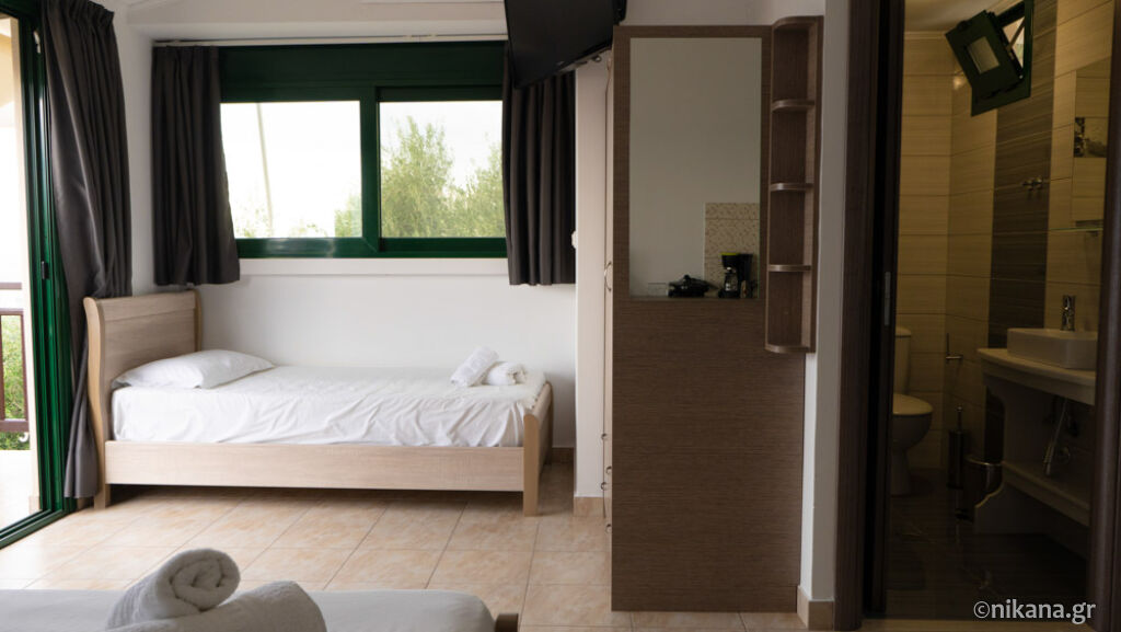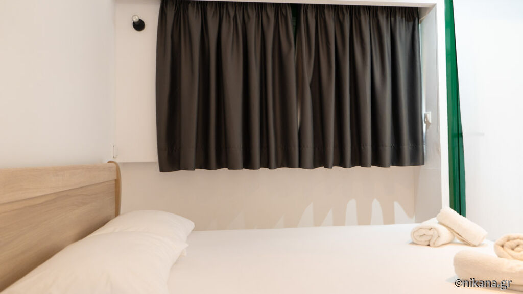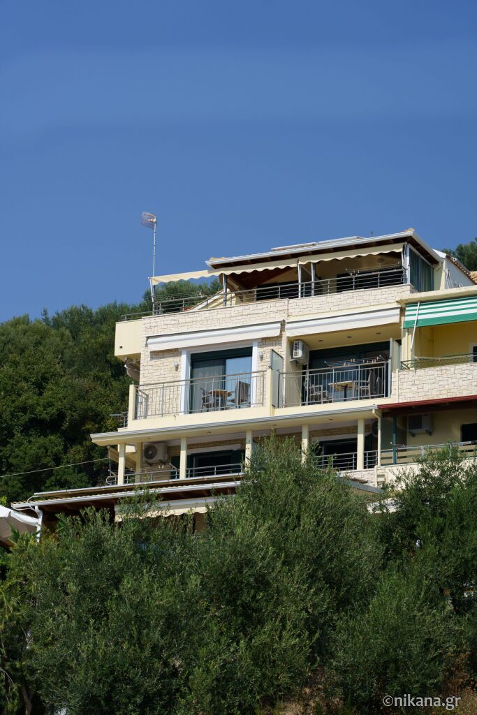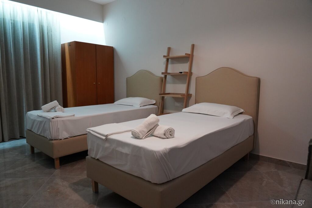 There are also five apartments (45-50m2) with one double bed in one bedroom and two single beds in the other room. Two apartments (no. 4 and 5) have a side sea view (no. 5 has one bedroom, not two), the others have a direct view.